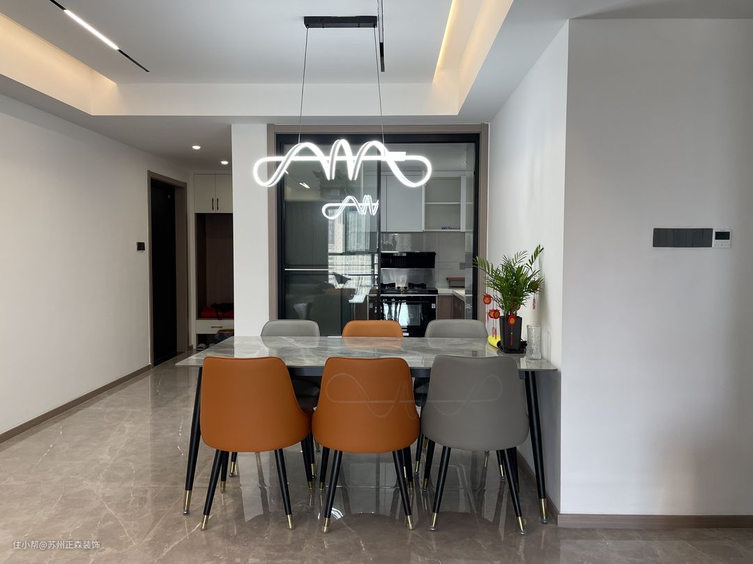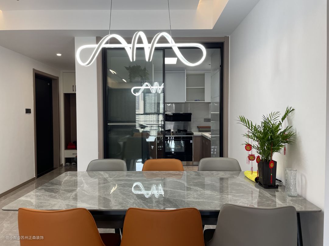 餐厅 选择了地面颜色接近的大理石台面,为整个空间带来了一份独特的奢华感,搭配上设计独特,具有艺术性的主灯,为整个餐厅增添了一份独特的韵味。