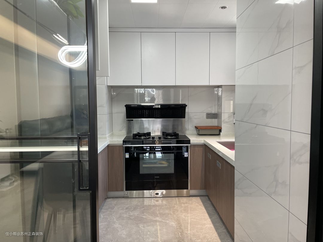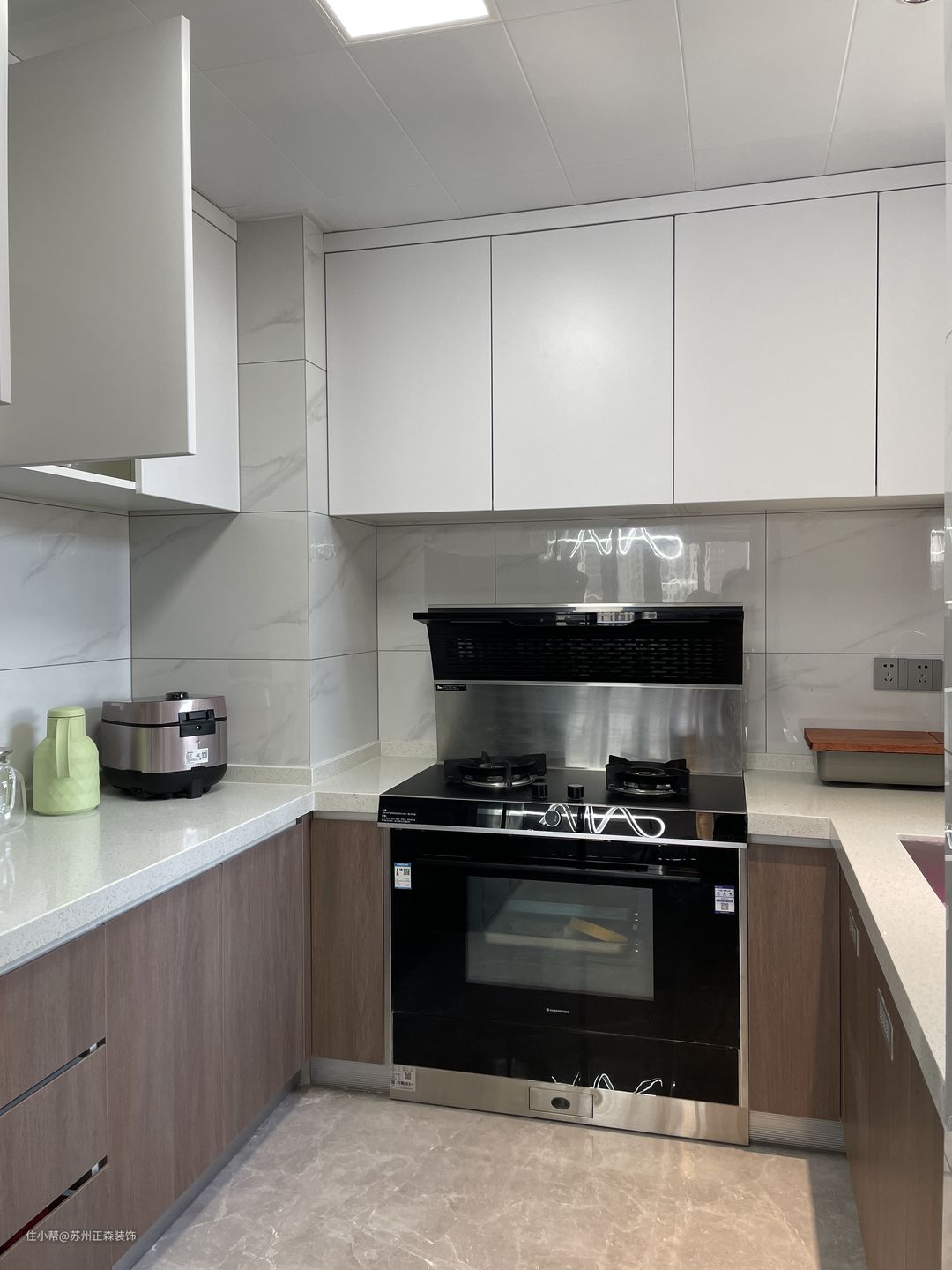 厨房 采用的是U型的设计,白色的吊柜搭配木色的橱柜,为整个厨房带来了一份简约而又温馨的氛围,在整个设计中,特别考虑了嵌入式洗碗机的设计,不仅节省空间,还提高了整个厨房的实用性,使得整个厨房工作更加便携高效。