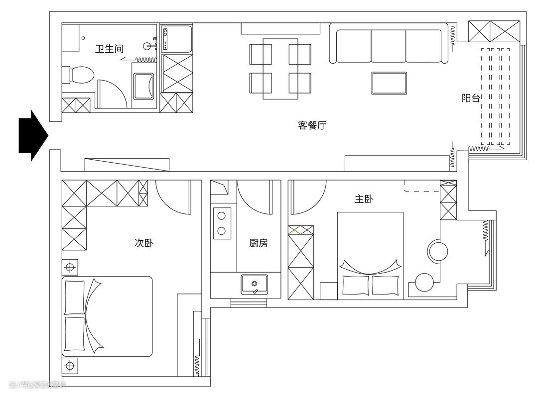 【业主故事】 屋主是一位单身妈妈,和女儿还有一只可爱的猫咪一起生活! 屋主喜欢法式田园风,所以设计师运用了大量的奶黄色和薄荷绿,搭配高档定制家具,不仅空间氛围唯美治愈!还将一种与世无争的的生活方式毫无保留地呈现在大众的眼前。 【户型解析】 房间户型方正,空间格局也特别好。 设计师通过规划布置,将空间均匀分布,实现明显动静分区的同时,也保证了居住舒适度! 【设计亮点】 1、阳台打通+客餐一体,公共空间整体呈现开放式布局。 2、巧用成品柜进行收纳,随意DIY,带来常挪常新的家居体收纳新体验! 3、采用拱形门廊、仿古家具、布艺沙发等,营造出一种闲致优雅田园氛围。 4、装修时还考虑到猫咪的喜好,设计了整墙的猫爬架,给猫咪打造了一个专属的活动区。 5、卫生间以单块玻璃屏风,实现干湿分离。