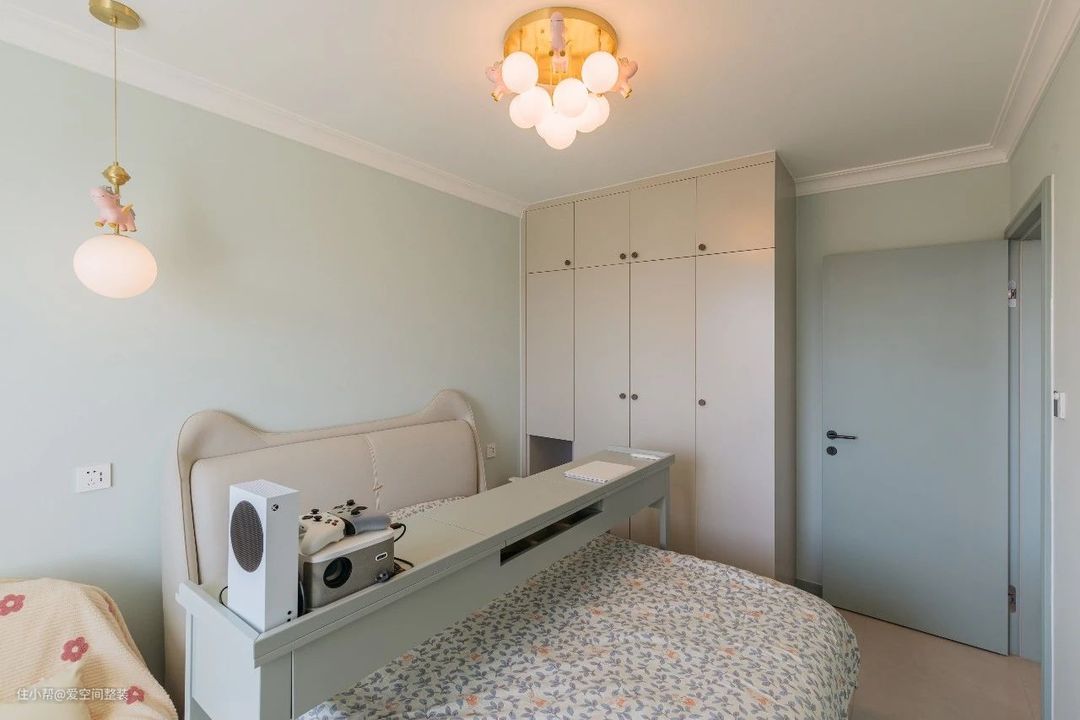 主卧 【设计亮点】 飘窗,通顶衣柜,可移动懒人跨床桌 【硬装搭配】 一进主卧就被拱形的飘窗吸引住了,窗外一片绿荫,这就是低楼层的优势; 墙壁通刷淡绿色乳胶漆,暖黄色的灯光,洒在少女感的碎花床品上,显得格外静谧; 床侧是定制衣柜,长1.6m,通顶设计+金属拉手,外观简洁大方,内部则以挂衣区为主,也符合业主只挂不叠的使用习惯; 床头一侧延伸出一个床头柜,底部悬空,可以放垃圾桶,或者扫地机器人,台面可以满足夜间置物需求,当化妆桌也绰绰有余; 房间最亮眼的设计就是那张可移动懒人跨床桌,专为懒人设计,躺在床上可以尽情刷剧、吃喝,不用的时候放在床尾,一点也不占空间;