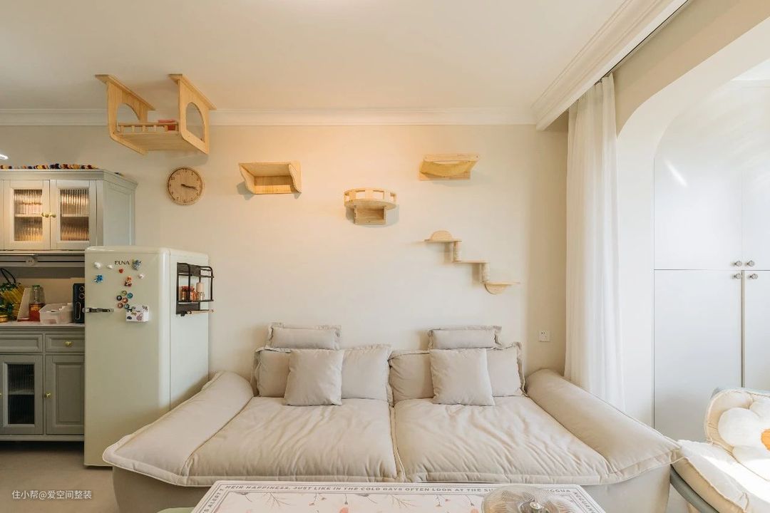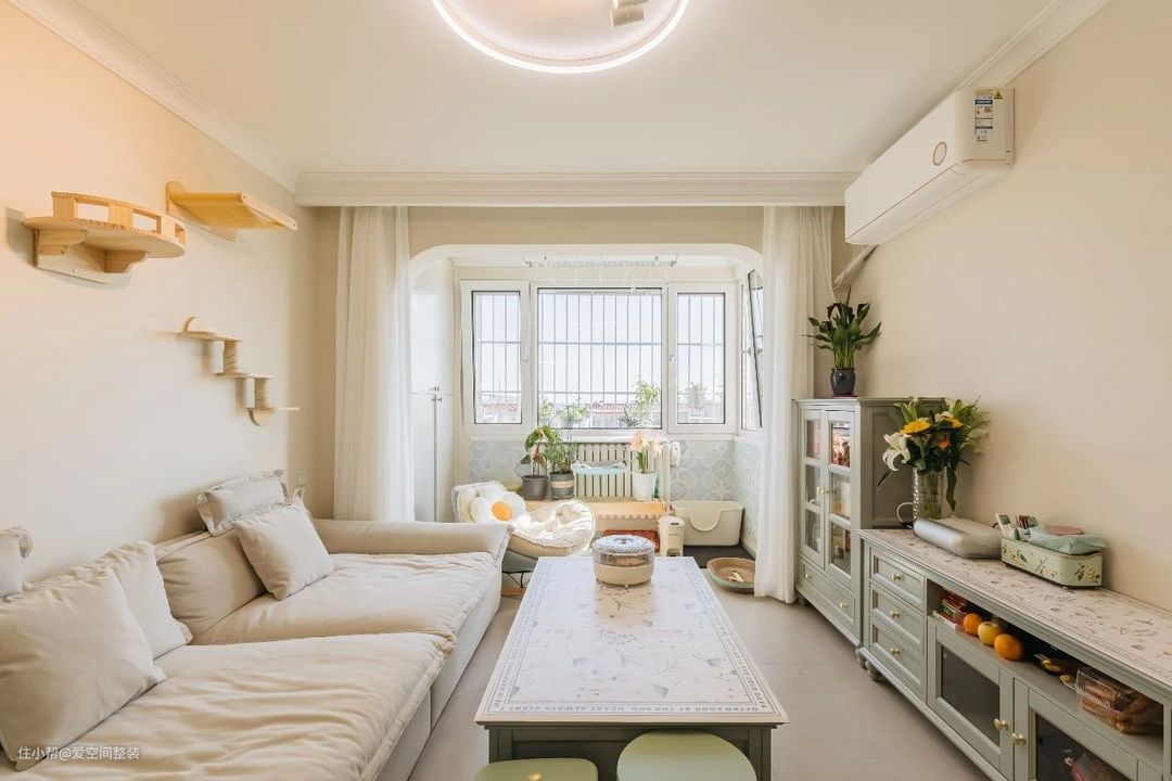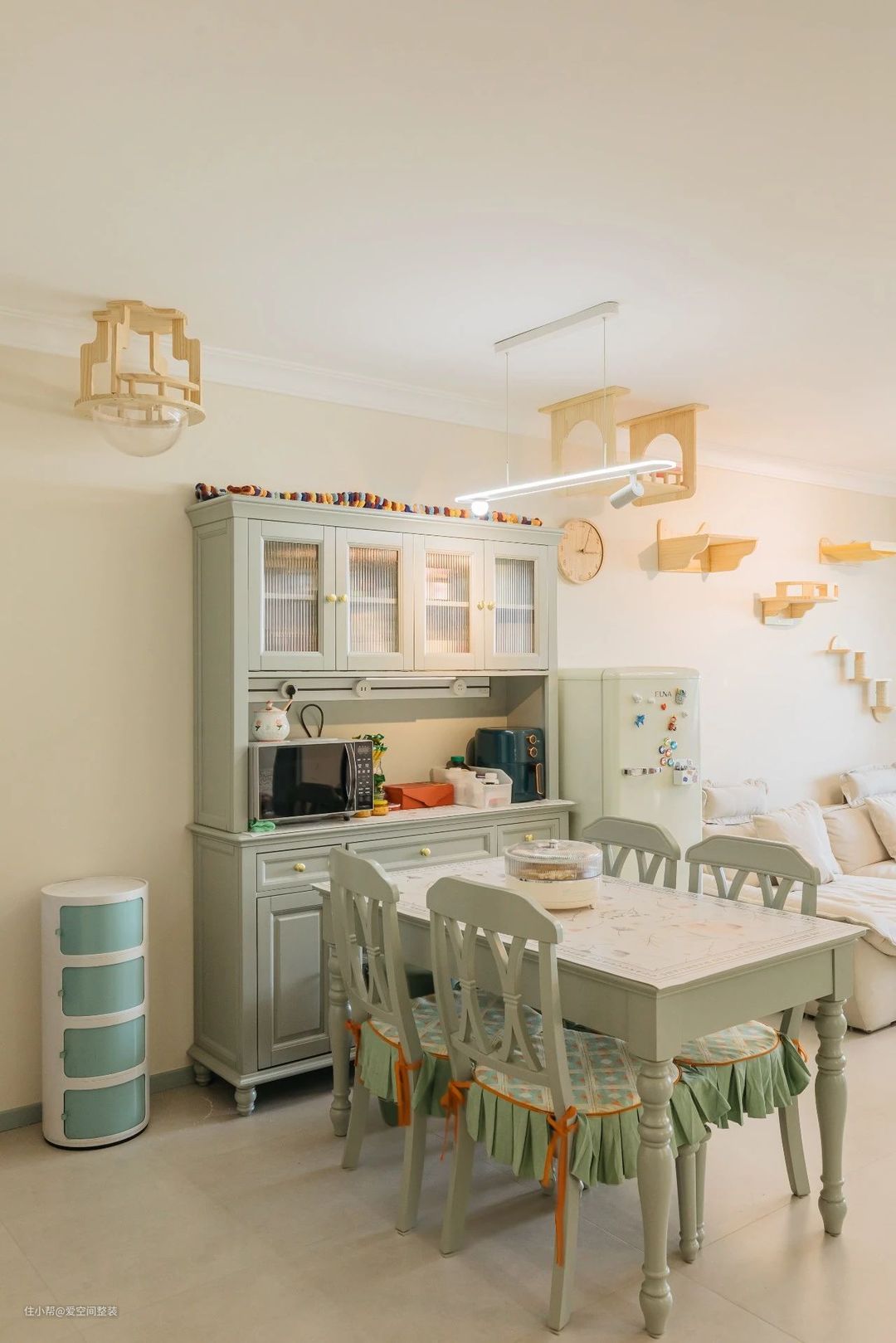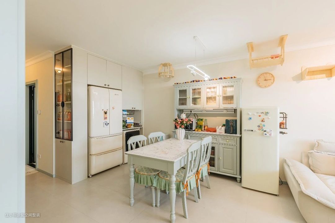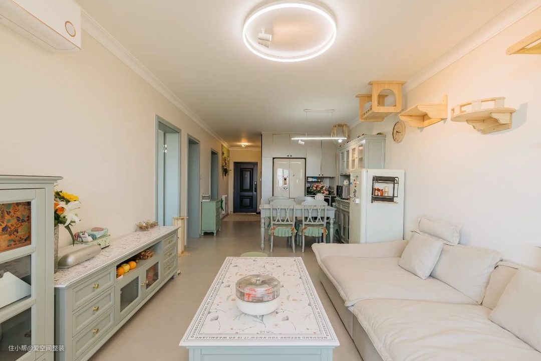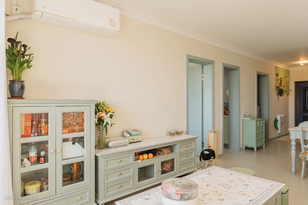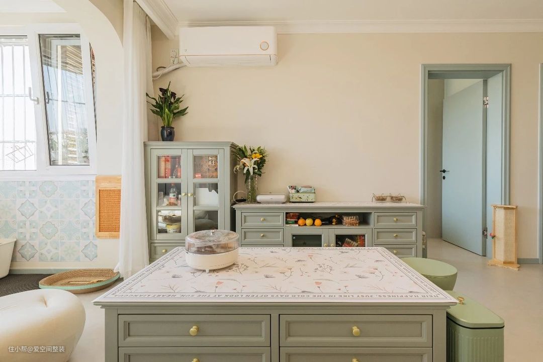 客厅 【设计亮点】 客餐一体、薄荷绿家具,懒人沙发,猫墙 【硬装搭配】 客厅和餐厅是一体式设计,不做分区隔断,搭配打通的阳台,整个空间大了一倍。 地面铺设60*1200的哑光地砖,踢脚线、门框、门套与内门统统选择爱空间的莫兰迪·蓝白系列,带有复古元素的家具穿插其中,看似朴拙却很有质感,颇有田园韵味。 茶几、电视柜还有餐边柜都是轻快凉爽的薄荷绿色,搭配汝窑色墙漆,中和了复古家具的沉闷感,清新气息扑面而来。 沙发背景墙设计成了猫墙,3阶跳台+卧仓+别墅窝,猫咪有了专属活动空间,还不占地面。 阳台打通后,垭口做成了弧形,窗外风景引入室内与阳台的绿植、花卉相映成趣,不需要啥软装,也十分出彩!