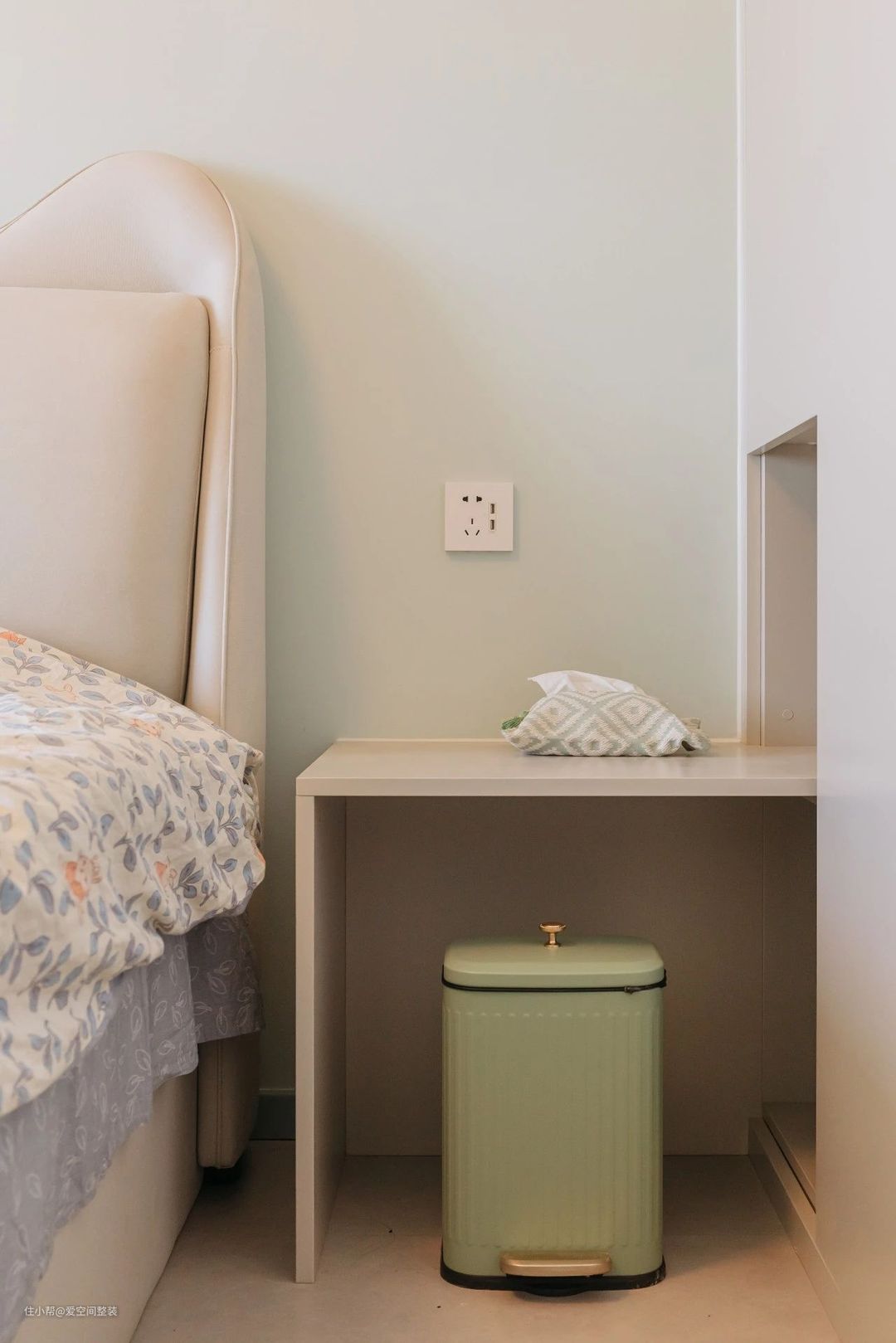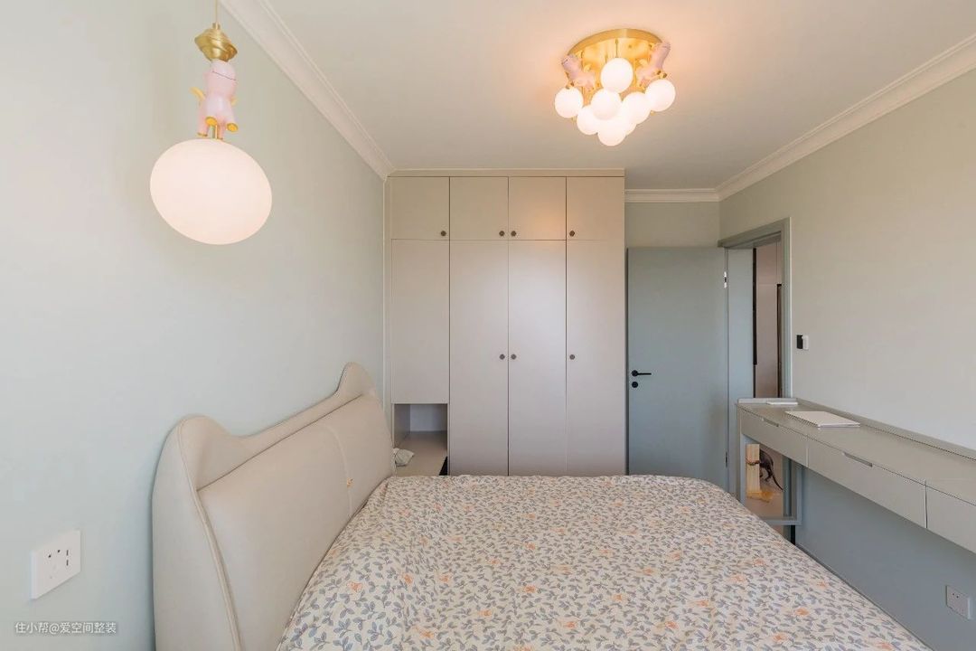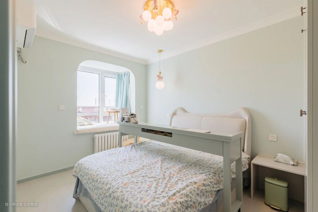 主卧 【设计亮点】 飘窗,通顶衣柜,可移动懒人跨床桌 【硬装搭配】 一进主卧就被拱形的飘窗吸引住了,窗外一片绿荫,这就是低楼层的优势; 墙壁通刷淡绿色乳胶漆,暖黄色的灯光,洒在少女感的碎花床品上,显得格外静谧; 床侧是定制衣柜,长1.6m,通顶设计+金属拉手,外观简洁大方,内部则以挂衣区为主,也符合业主只挂不叠的使用习惯; 床头一侧延伸出一个床头柜,底部悬空,可以放垃圾桶,或者扫地机器人,台面可以满足夜间置物需求,当化妆桌也绰绰有余; 房间最亮眼的设计就是那张可移动懒人跨床桌,专为懒人设计,躺在床上可以尽情刷剧、吃喝,不用的时候放在床尾,一点也不占空间;