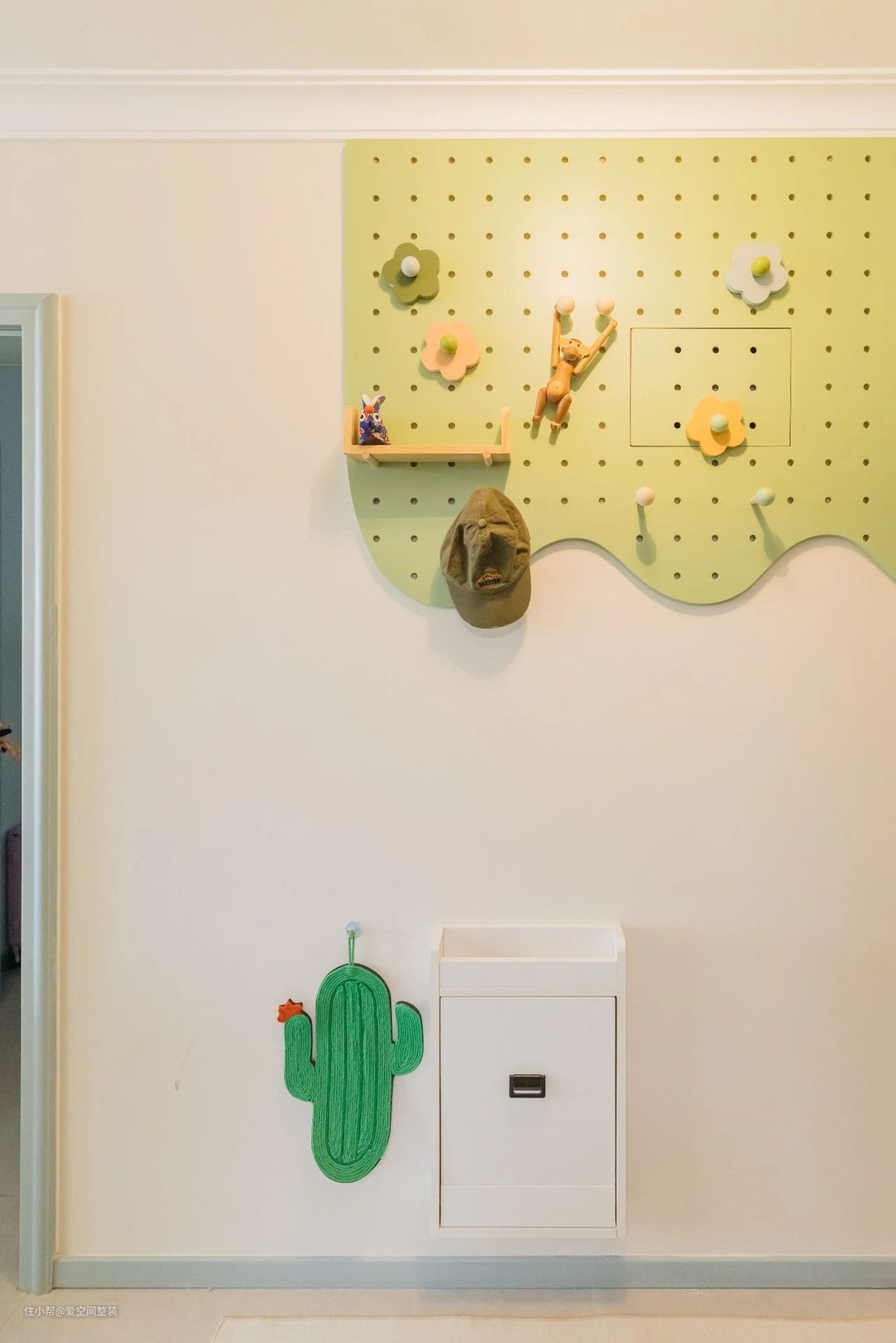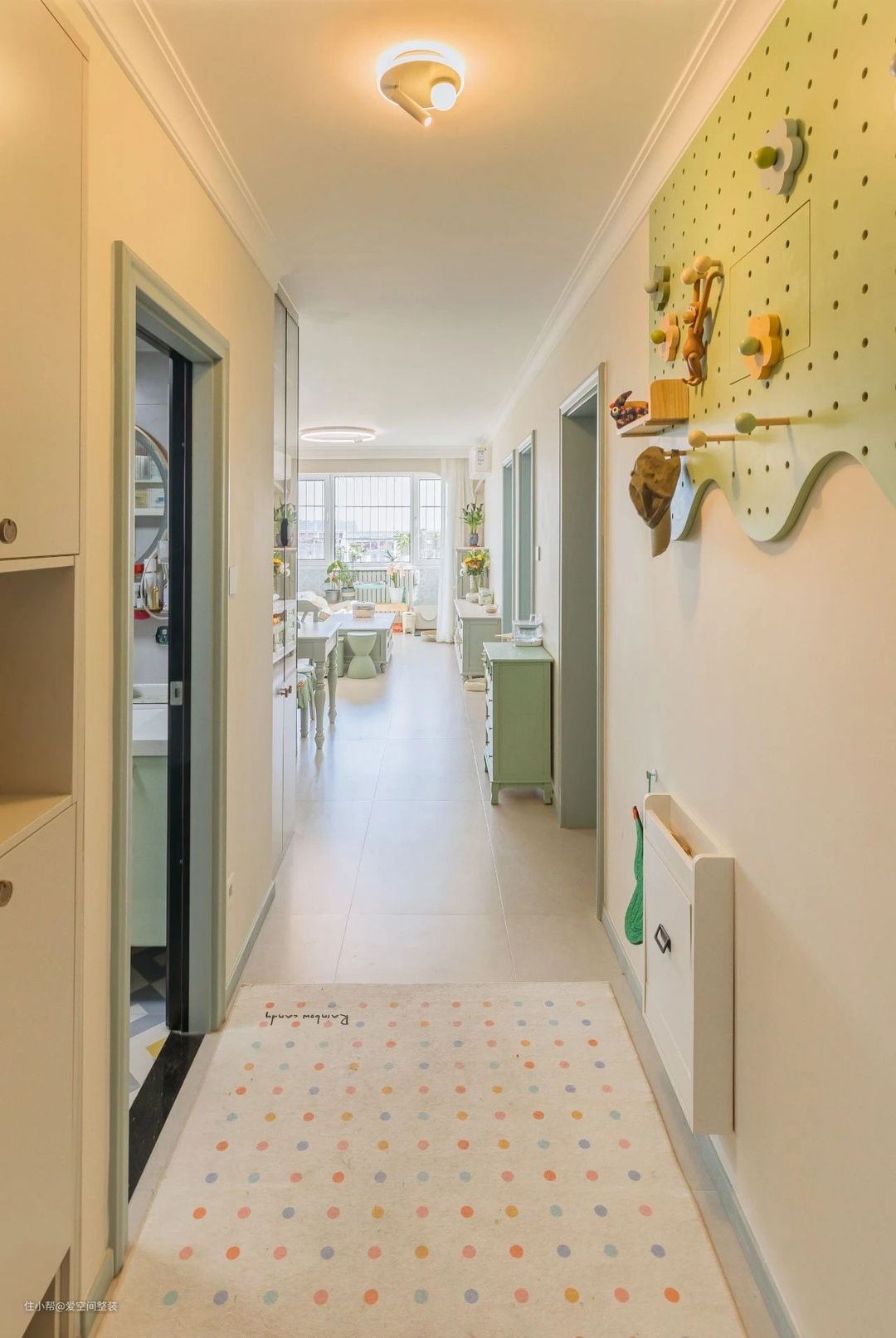 玄关 【设计亮点】 顶天立地玄关柜,洞洞板收纳 【硬装搭配】 玄关是走廊型,进门左侧做了一组内嵌式的玄关柜,顶天立地,总长0.9m,可满足日常出行的各种收纳需求。 右侧墙面,安装了一个薄荷绿色的洞洞板,既能遮挡入户电箱,还能当做挂衣区,搭配下方的折叠换鞋凳,简直是小户型的福音!