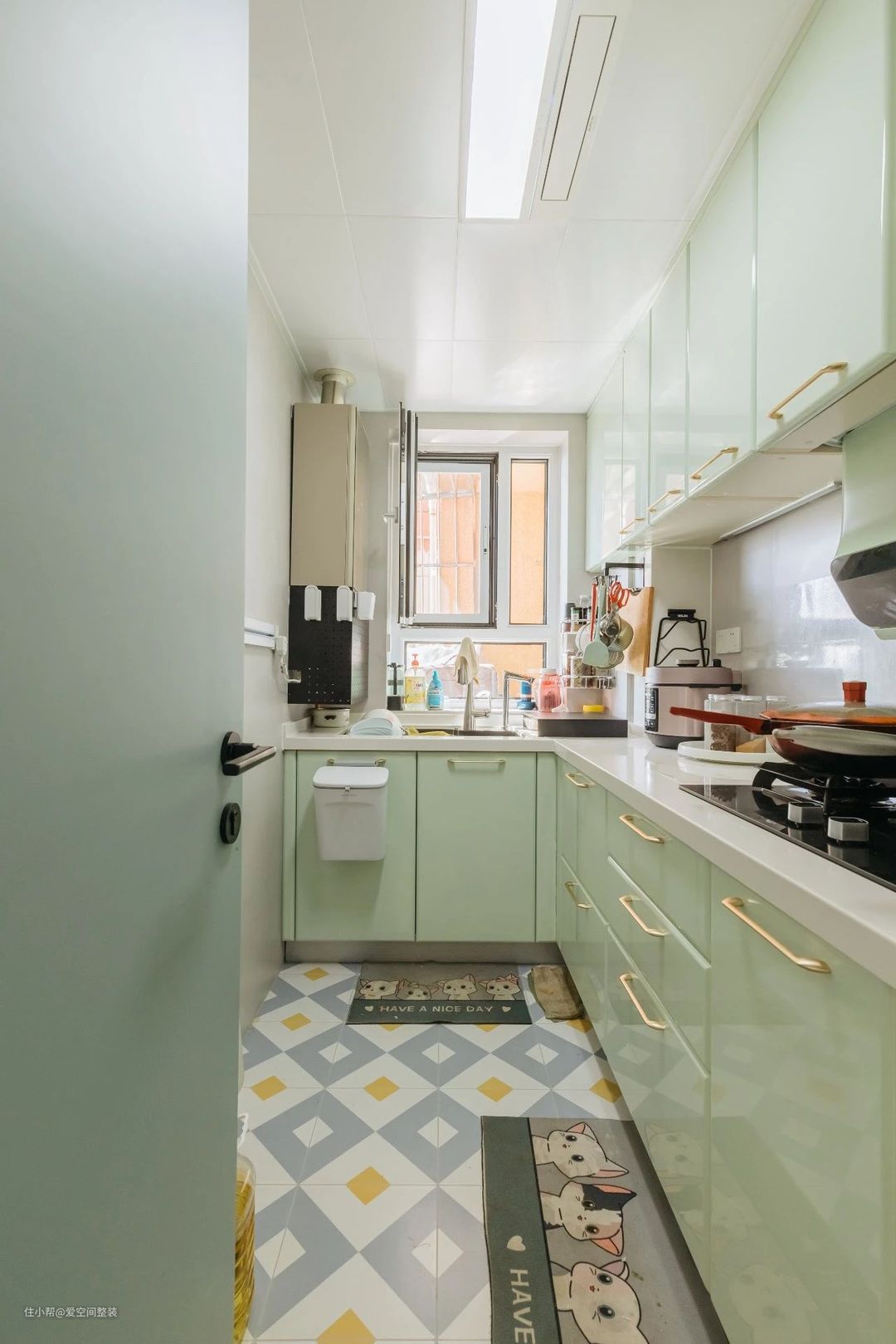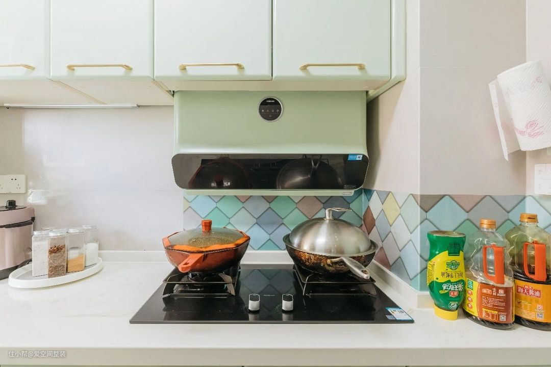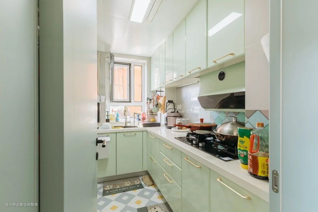 厨房 【设计亮点】 L型布局,薄荷绿橱柜 【硬装搭配】 厨房是L型布局,洗菜-备菜-烹饪,做饭动线合理,空间利用率高。 橱柜选择的是爱空间的法尼尼大艺术家系列,白色亮面吊柜+薄荷绿地柜,搭配金属把手,清爽干净,即使是闷热的夏天,也能感觉到清爽。 吊柜下方还暗装了一条灯带,晚上备菜时可以补充照明,不会因为背光而影响安全以及烹饪的效率。