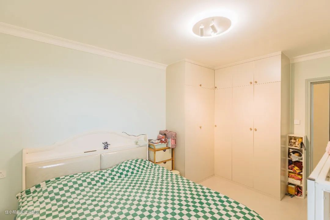 次卧 【设计亮点】 极致收纳 【硬装搭配】 次卧墙壁通刷淡绿色乳胶漆,清浅舒爽不会过于夸张,搭配绿色方格床品,打造的空间在夏日更显清爽宜人。 其他布置延续了主卧的风格,不同的是衣柜是转角设计,搭配缝隙置物架,收纳绝对满分!