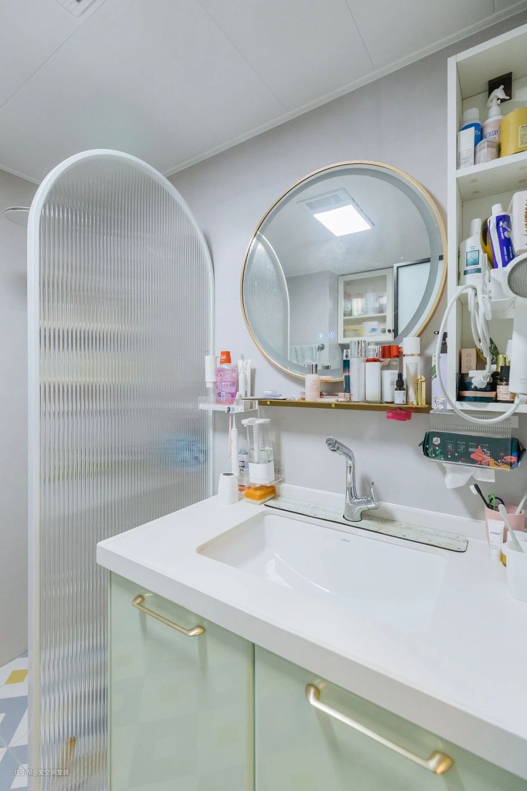卫生间 【设计亮点】 小花砖,干湿分离 【硬装搭配】 卫生间空间不大,洗漱台、马桶、淋浴区分别设计在房间的三个角落。 浴室柜是爱空间的法尼尼大艺术家系列,一体式台盆+圆形镜面+墙面置物格,放上洗漱用品略显凌乱,但好放好取,收纳力绝对满分。 洗漱台和淋浴区中间安装了一面宽90cm的玻璃屏风,8mm钢化长虹玻璃配白色拱形边框,实现干湿分离的同时,颜值也是绝绝子!