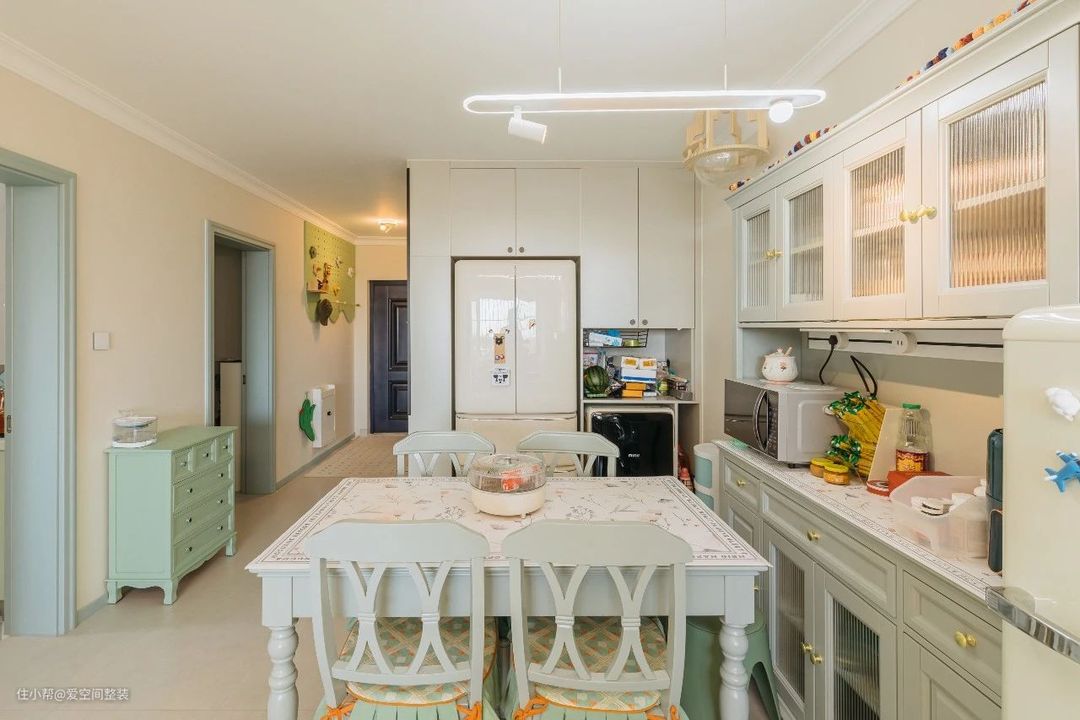 餐厅 【设计亮点】 法式极简餐桌,定制餐边柜+成品餐边柜 【硬装搭配】 餐桌和餐椅是法式极简设计,搭配餐边柜、吊灯,散发着别样的法式浪漫。 餐边柜是L型布局,一面整墙定制,嵌入冰箱,侧边还做了一组玻璃展示柜,不止可以放酒,书籍、装饰都有了容身之处,既美观又高级。 另一面餐边柜是与餐桌同款式的成品收纳柜,三段式收纳,搭配方形餐桌,不奢华,却足够清爽。