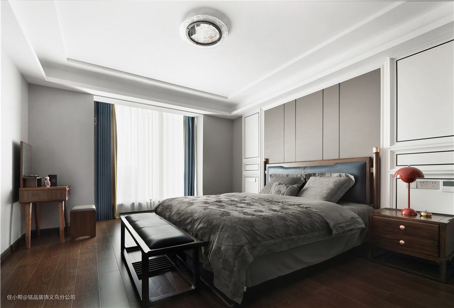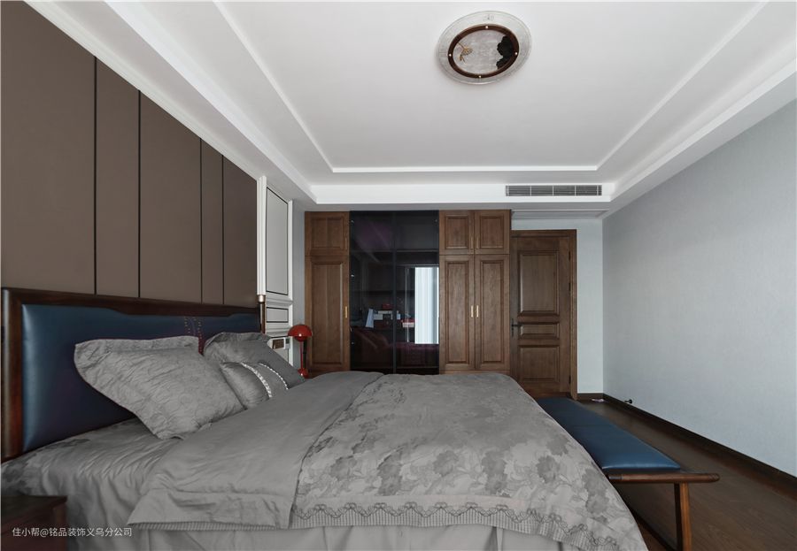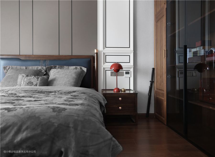 主卧的主灯设计,运用了荷池游鱼的意象,取“鱼水和谐”之意,祝福朱女士与先生生活幸福,感情美满。靛青之色,在传统文化中作为一种传统色,典雅时尚,广受人们的喜爱,我们在靛青色调的基础上,搭配云母色的床品织物,点缀水墨牡丹纹饰,在温馨舒适中,还你一场古典清梦。