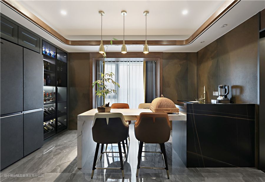我们在餐厅与茶室的设计上,取竹梅姿态之美,搭配水墨山水画,在厅室之间营造出山高水远、竹秀梅傲的意境风采。 山石嶙峋,红梅傲雪,在古色古香的居室中感受东方艺术里的风雅清致,意境悠悠,这份灵韵与志趣,令人心怀畅慰,食指大动。品黄酒,尝醉蟹,佳肴入口,也是一桩风雅妙事。朱女士的先生有收藏红酒的爱好,我们在茶室空间里贴心设计了一处风格典雅的酒柜,能够随心安放心爱的美酒,尊享级的酒柜品质,展现陈列的韵致,这何尝不是美酒爱好者的乐事?