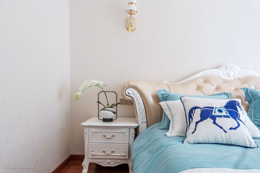 卧室的床品选择很受我喜欢。清新的天蓝色和白色拼接床被让人心情愉悦,身心舒适。欧式大床美观好看。还有大大的窗户和清新的白色飘窗,让卧室的光线非常充足,早上起床拥有一个好心情。