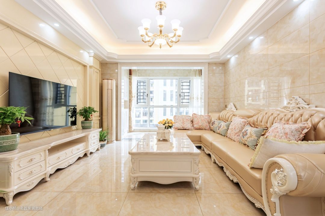 客厅大面积铺设大理石材料,沙发,背景墙等软硬装的整体色调为浅色系,看起来非常的干净,充满温馨的感觉。特别喜欢设计师给我选的这款真皮沙发,风格很欧式贵族,款式大气,能够容纳多人,体验感也非常舒适。