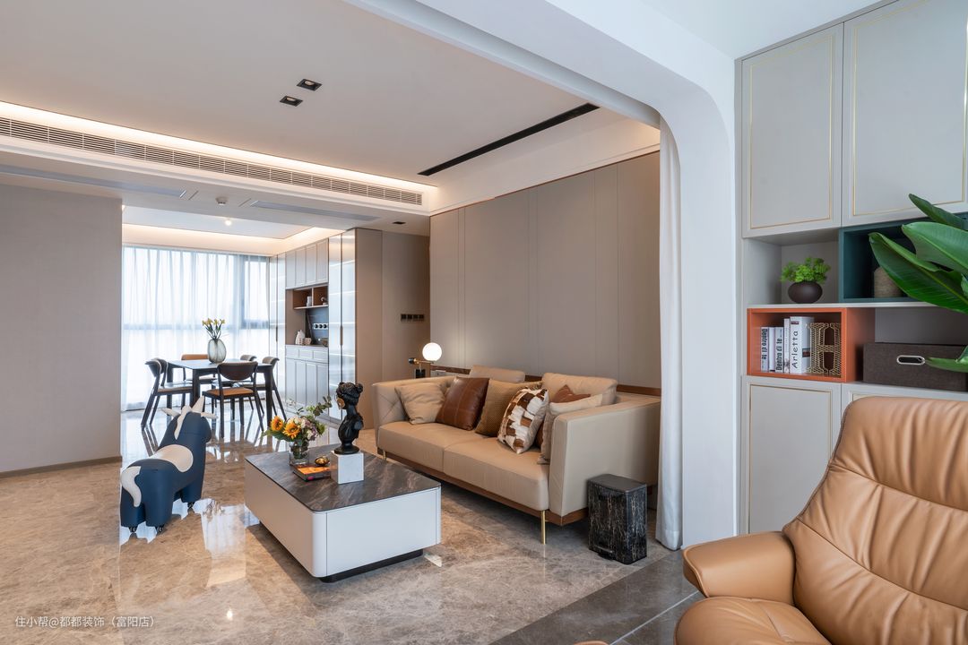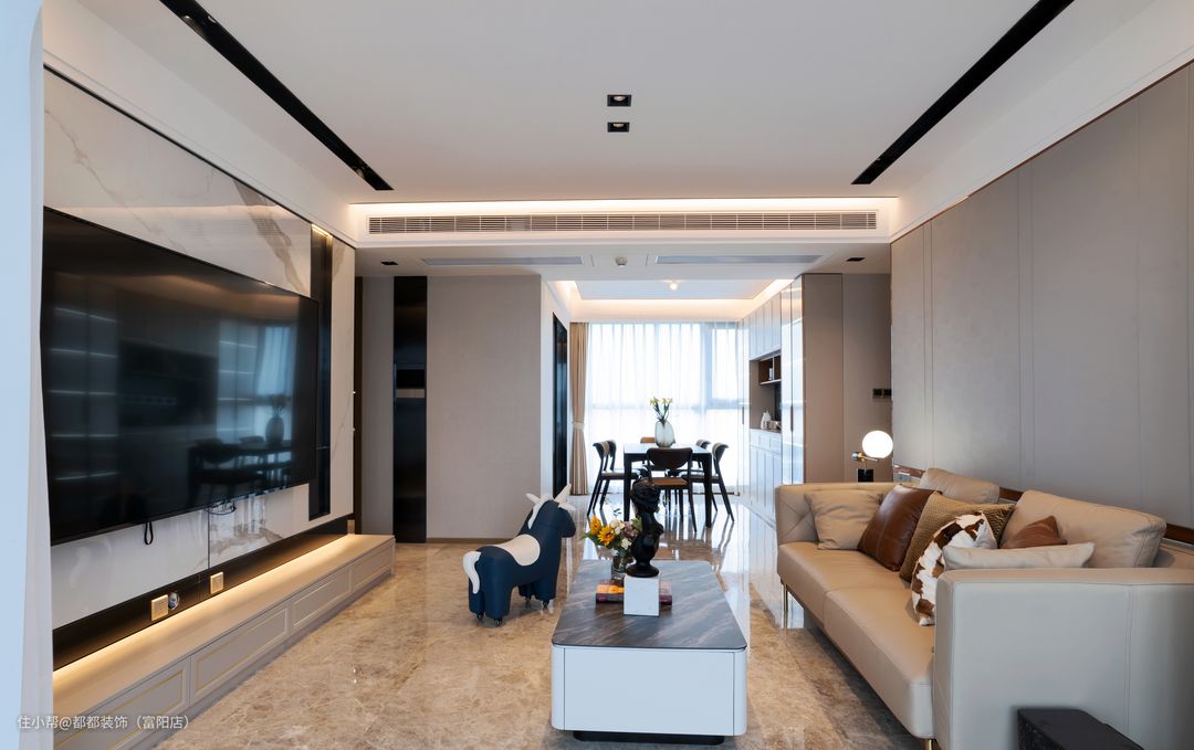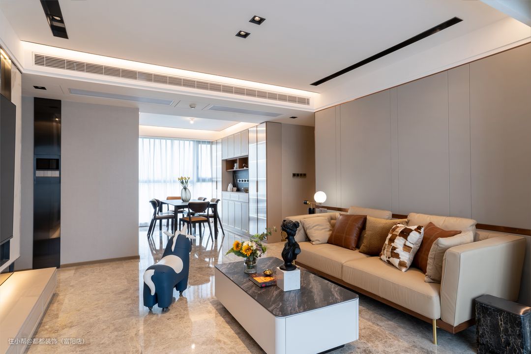客餐厅一体化,客厅阳台全部打通,纳入客厅,空间宽阔敞亮,采光更为通透,无主灯设计简洁利落,多重光源营造出不同的风格的氛围。 沙发背景由原来单调的白色乳胶漆铺设改成了硬包,在色系上选择了太空灰,作为背景色,点缀的恰到好处,再加上整体样式上的不规则分布和一整圈的金属线条,使原本沉闷的墙面变得轻快又精致。 在家具的选择上,材质选用了进口头层牛皮,搭配黄铜金属高脚,这一组合使得沙发的光泽与质感都达到了极致,而在颜色上仍然采用大面积的浅色,在保持整体色调一致的基础上,利用抱枕的颜色进行深浅的对比与点缀。 电视背景墙选用了白色大理石,鱼肚白的颜色加上灰色的花纹,与黑色大理石桌面茶几作出强烈对比,使得空间明亮又高级。 一排落地抽屉满足储物功能,抽屉的样式上加入了金属线条,低调却又不可或缺。石材与木材的碰撞,奇妙又契合,两者结合,处处透露着新房现代与轻奢的风格。