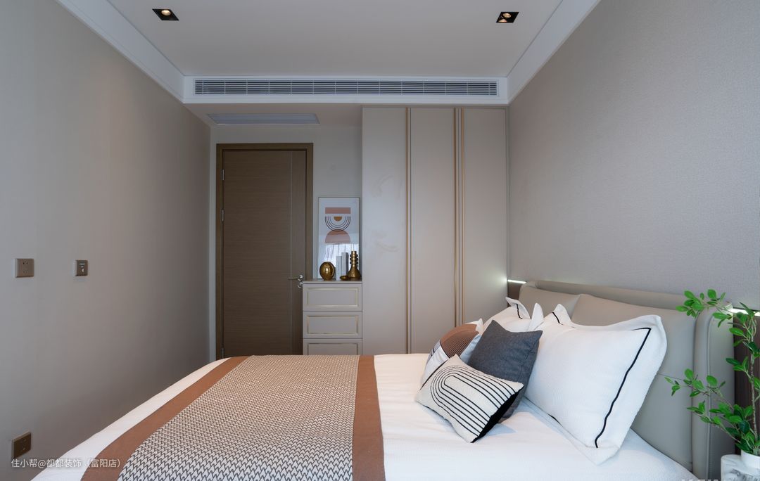 卧室往往给人一种令人心安的沉稳感,洗个热水澡,被柔软蓬松的被子包裹,在柔和的灯光下,放松身心,而后进入甜美温和的梦乡。 次卧的设计更注重简约舒适,米灰的墙面搭配木饰面的床头背景,床品以素色为主,柜子颜色与墙面相呼应,营造一种沉稳安静的氛围。 主卧背景板采用温馨的浅咖色,黄铜金属线条做点缀,搭配手工拉点工艺真皮大床,凸显质感,精致而舒适。 实木一体化的梳妆台,把储物空间做到最大化,温柔的用色从里到外都透露出一种内里的静谧婉约,与整个空间的格调十分相符,金色线条的点缀显得更加精致典雅。