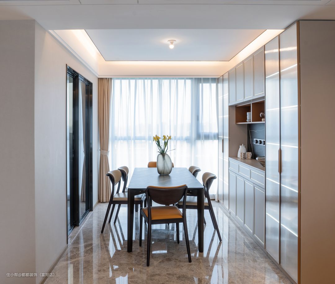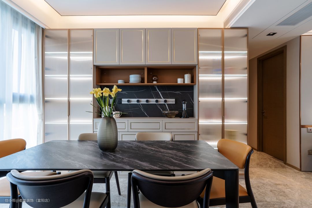 本户型是双阳台的设计,朝北的餐厅,附带北阳台,采光非常好,餐厅的设计以简洁大方为主,满足女主人实用和温馨的需求。 餐边柜的造型顶天立地无死角,中部镂空的局部留白使得空间不会过于压抑。两边的高柜柜门采用了金色边框的长虹玻璃,作为展示柜,通透又不会过于单调。 中部地柜和吊柜门板增加了简欧的造型,色调上采用经典柔雅白搭配黄铜色金属包边,精致不言而喻。 配上黑色石纹的餐桌与真皮座椅,与客厅区域进行呼应,让整个客餐厅营造出一种轻奢优雅的氛围。