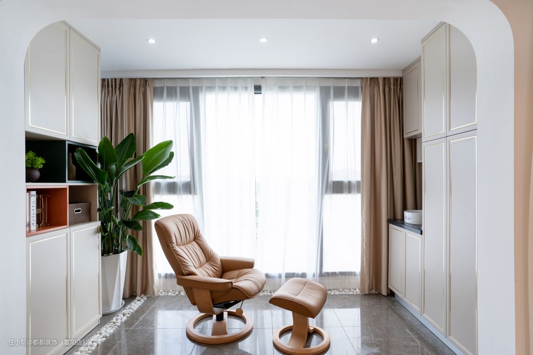 原本的阳台移门被拆除,打通了客厅与阳台的空间,通透又明亮,将垭口造型设计为拱形门,复古曼妙,有拉高层高的效果。放置挪威躺,阳台处便成了一处休闲角,晚上回到家,打开阳台温暖的灯光,慵懒的窝在挪威躺椅上,疲惫感一扫而光。