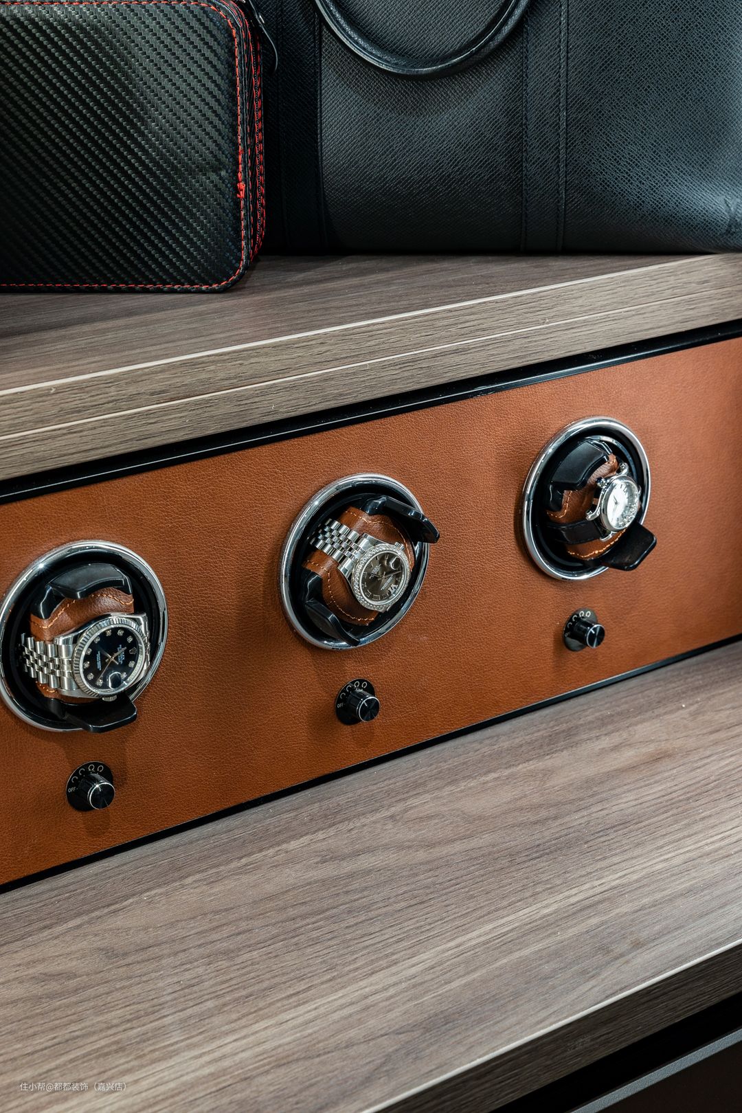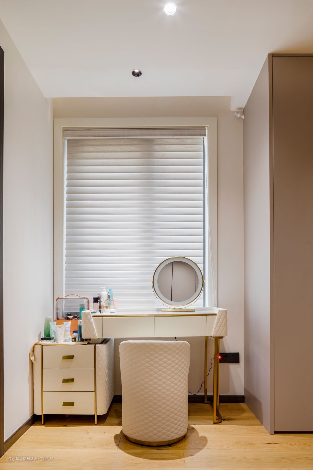 梳妆台选择白色与金属框架相结合,在百叶窗的衬托下,让卧室时刻散发温柔、优雅的独特魅力。置物柜设计摈弃了繁芜的装饰,流畅大方,各自承担着不同的功能,木质置物柜整齐放置着精美的包包和手表,有力的色彩搭配如同跳跃着的音符,将主卧装扮得十分简练、硬朗。