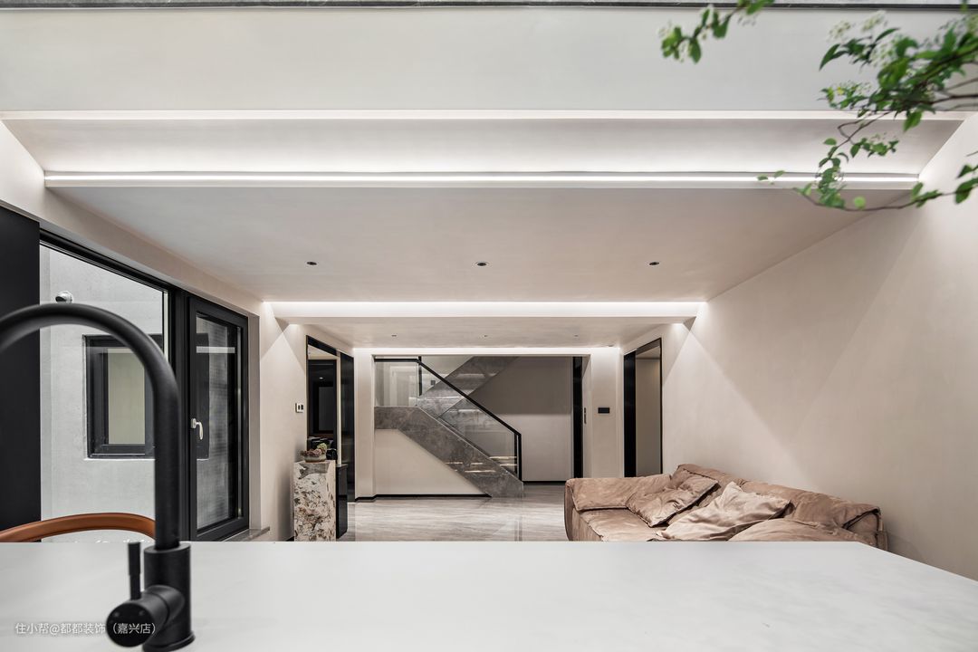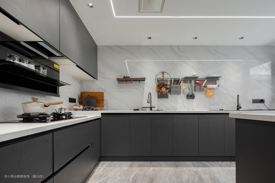 西厨空间以黑白的色调为渲染,干净简约的柜体立面,以体块与线条交叠出优雅的视觉张力,厨房整体呈U型设计,“洗——切——炒”分区,操作流线更流畅。