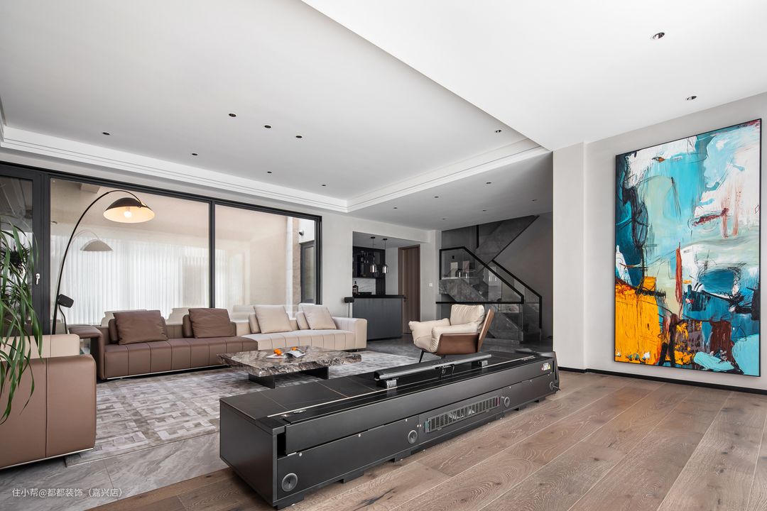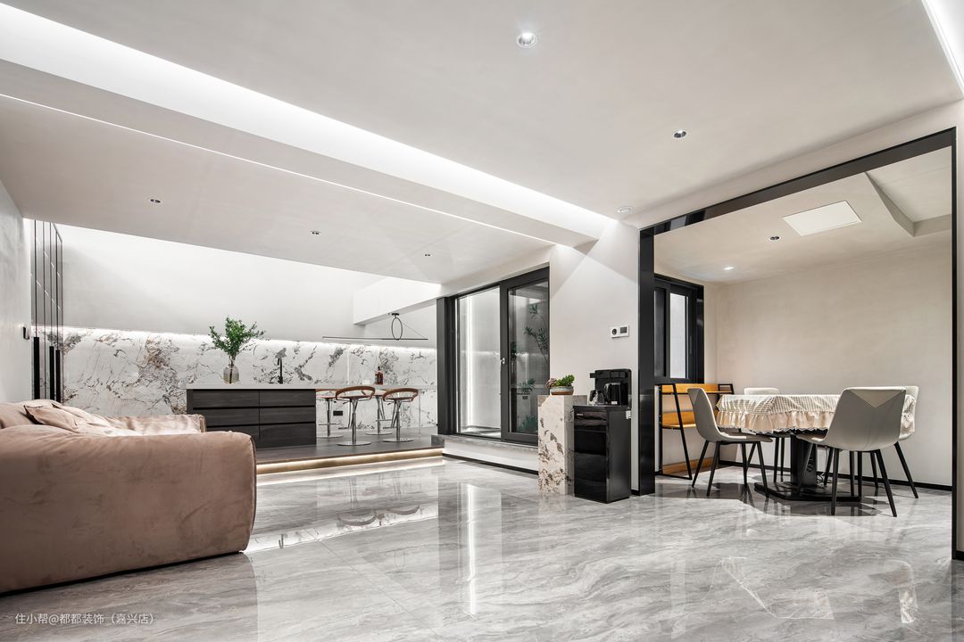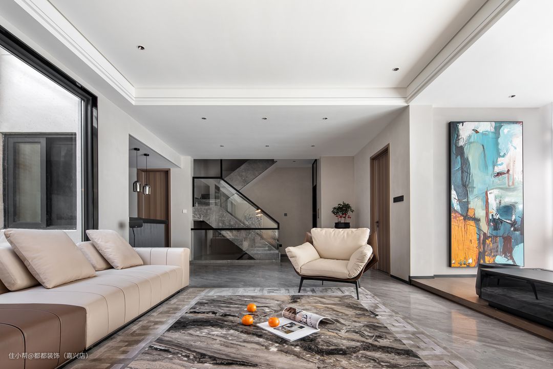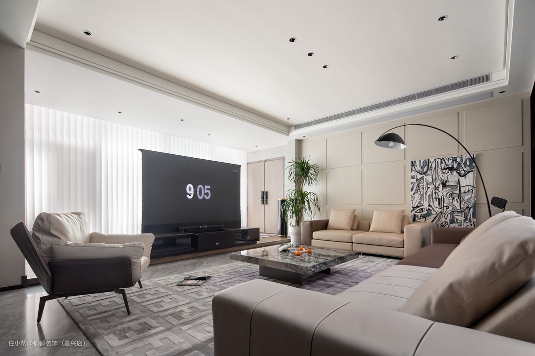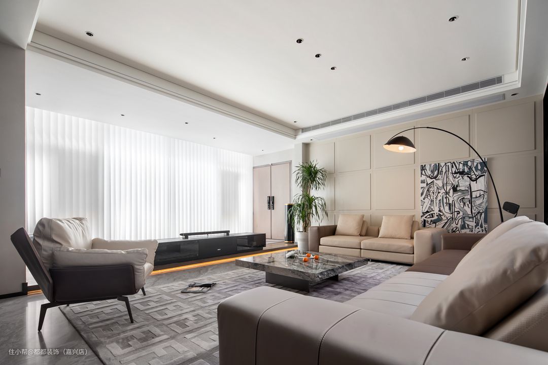 客厅中央的可升降电视机+收纳柜的组合,让智能科技与颜值并存,精彩的生活一键开启,隐藏在柜中的小影院,将生活的惬意感展现的淋漓尽致!在棕白调的空间,搭配上大理石纹理茶几,摆上同色系皮面沙发,布置上弧线钓鱼灯和抽象装饰画点缀,为理性空间注入一抹柔情,家的温馨感跃然眼前。柔和纱帘将引入室内的自然光线过滤的和煦温柔,渲染出轻松、自由、温暖的空间氛围,休闲时,播放舒缓的音乐,品上醇香的咖啡,惬意极了!