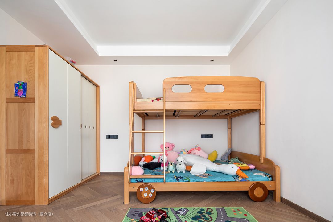 儿童房亮点在于把床单换成了色彩缤纷的配色,各种可爱的玩偶增加了空间的活力,将温暖的木板进行鱼骨拼,更好地呈现出木质本身的纹理细节,小车造型的双层床设计,增加空间趣味性的同时,处处洋溢着孩子的天真与童趣。