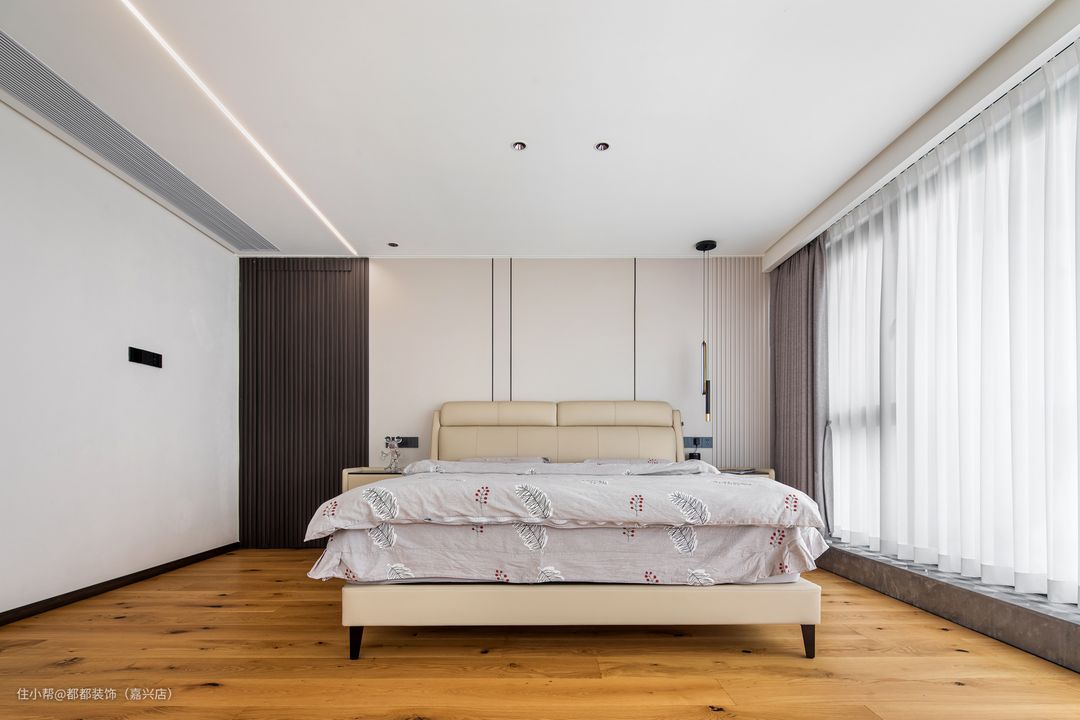 设计师特别定制集衣帽间、休闲区、化妆台于一体的主卧室,床头背景墙奶油色木饰面与深棕色木格栅形成冷暖碰撞,布置浅色系纯棉床品,优雅协调,姜黄色懒人沙发作为跳色,流畅的造型,时尚百搭。