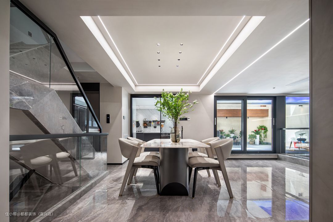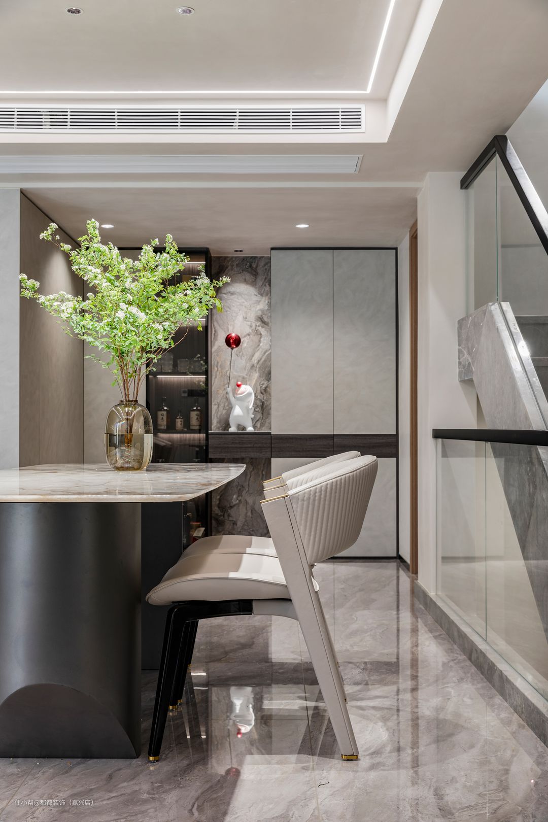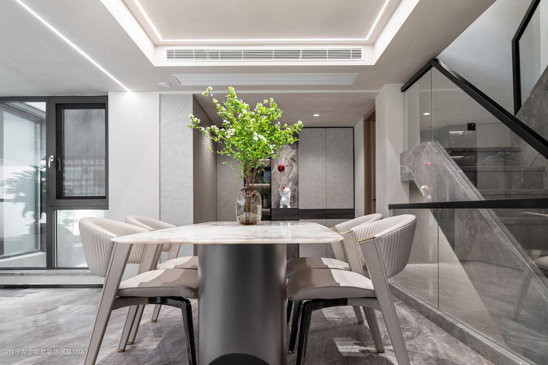 开放式格局延袭而下,虽不带一丝隔断,却在以杏色再到白色的转变之中,形成视觉上的区分,白色餐椅与大理石亮面餐桌,别具一格的纹路干净利落,大束绿植的点缀,都使就餐空间酣然于通透自在的豁朗,生活形态也渐次向外自由延伸。