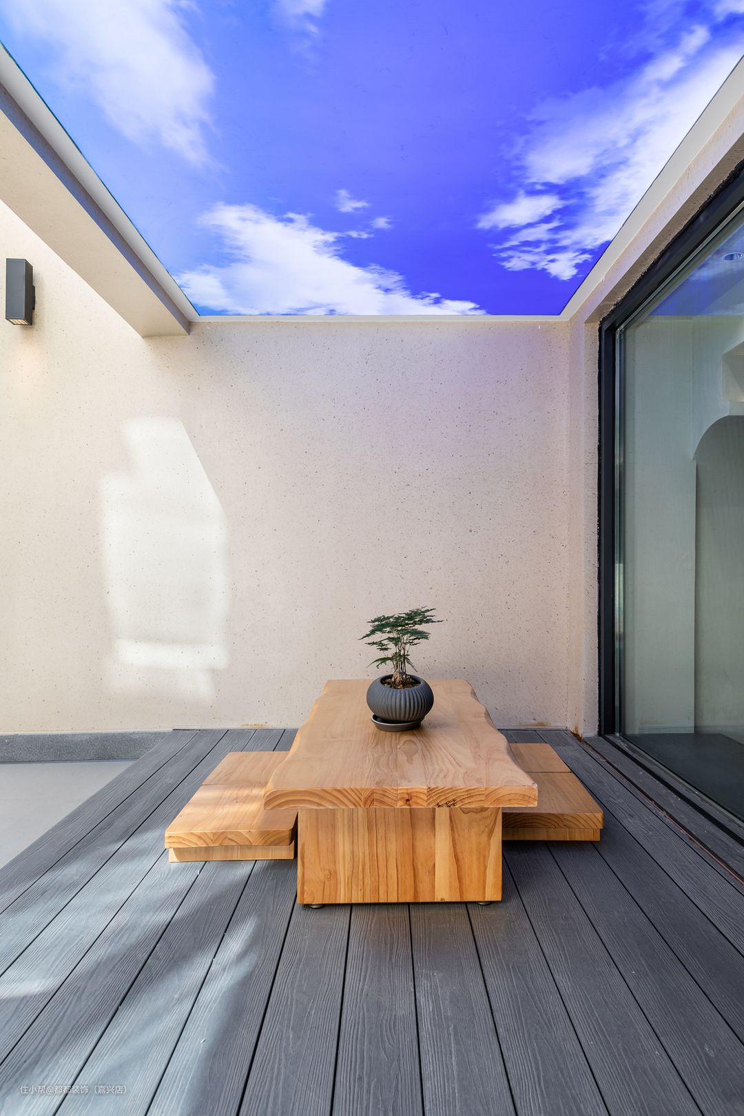 休闲区依然是开放式的布局,灰色的大理石地面砖、靠墙的科技绒沙发,整个空间都充满自然舒适的简约氛围感;原木的桌椅的品茶区搭配蓝天白云顶,惬意又很随性自由。