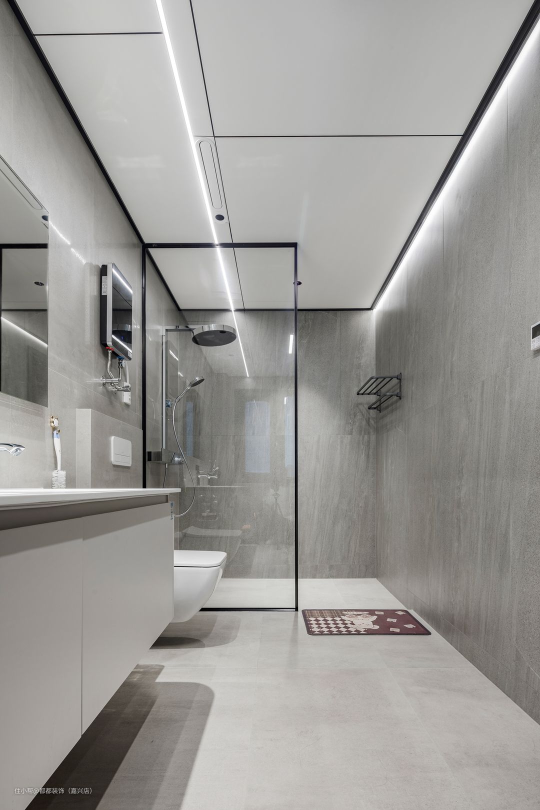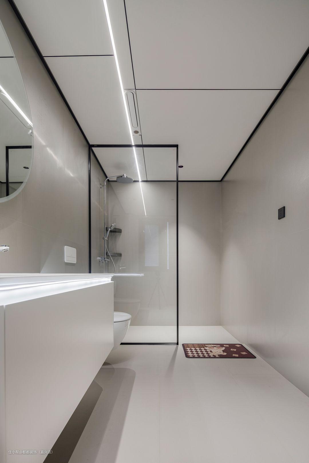 卫生间采用开阔通透的玻璃移门做干湿分离设计,呈现出一个现代时尚的卫浴空间感, 台盆下方设计悬挑收纳柜,解放干区台面,同时不会有视觉厚重感,台下盆+镜柜组合,镜柜底部顶部都装上灯带,氛围感升级,极具舒压气韵。