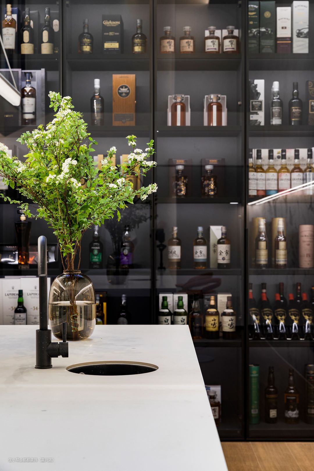 岛台以白色、棕色木纹覆盖,配以高脚橙色凳子,质感与色彩的碰撞,赋予空间时尚的气息,将大气简洁弥散其间,在此尽享舒适惬意的慢生活体验。黑色的酒柜通过灯光折射,如水如镜,轻盈澄净,梳理出优雅而精致的品酒氛围。