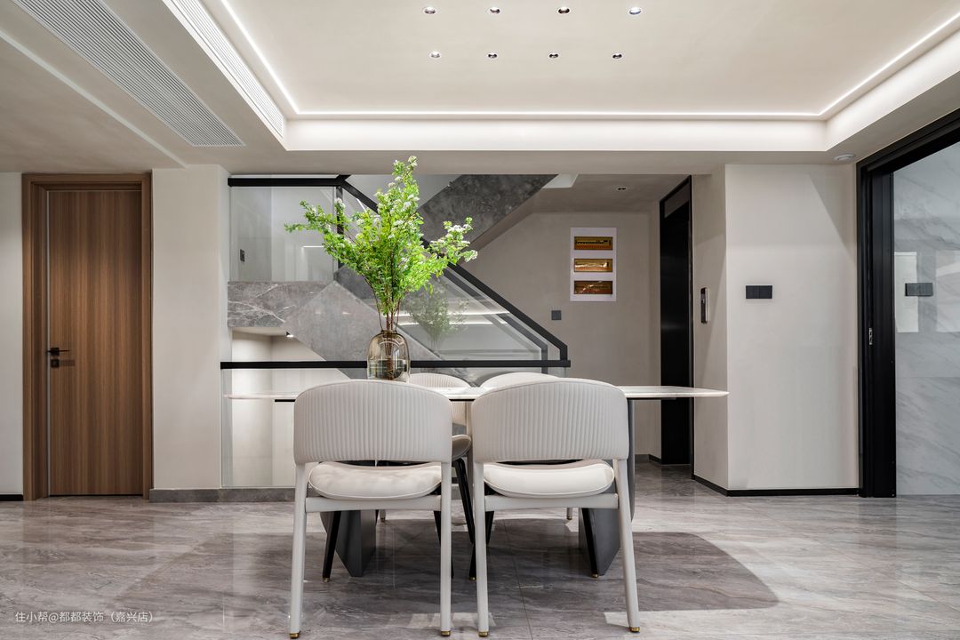 开放式格局延袭而下,虽不带一丝隔断,却在以杏色再到白色的转变之中,形成视觉上的区分,白色餐椅与大理石亮面餐桌,别具一格的纹路干净利落,大束绿植的点缀,都使就餐空间酣然于通透自在的豁朗,生活形态也渐次向外自由延伸。