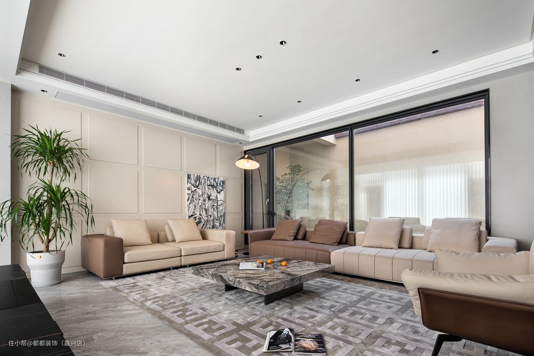 客厅清爽利落,采用摩卡棕+米色的经典配色,呼应屋主本身的理性纯粹气质,无主灯的设计让整体更加规整,四散下来的光均匀柔和,不会过分刺眼,靠墙的一抹翠绿,成为空间鲜活生命力的象征。