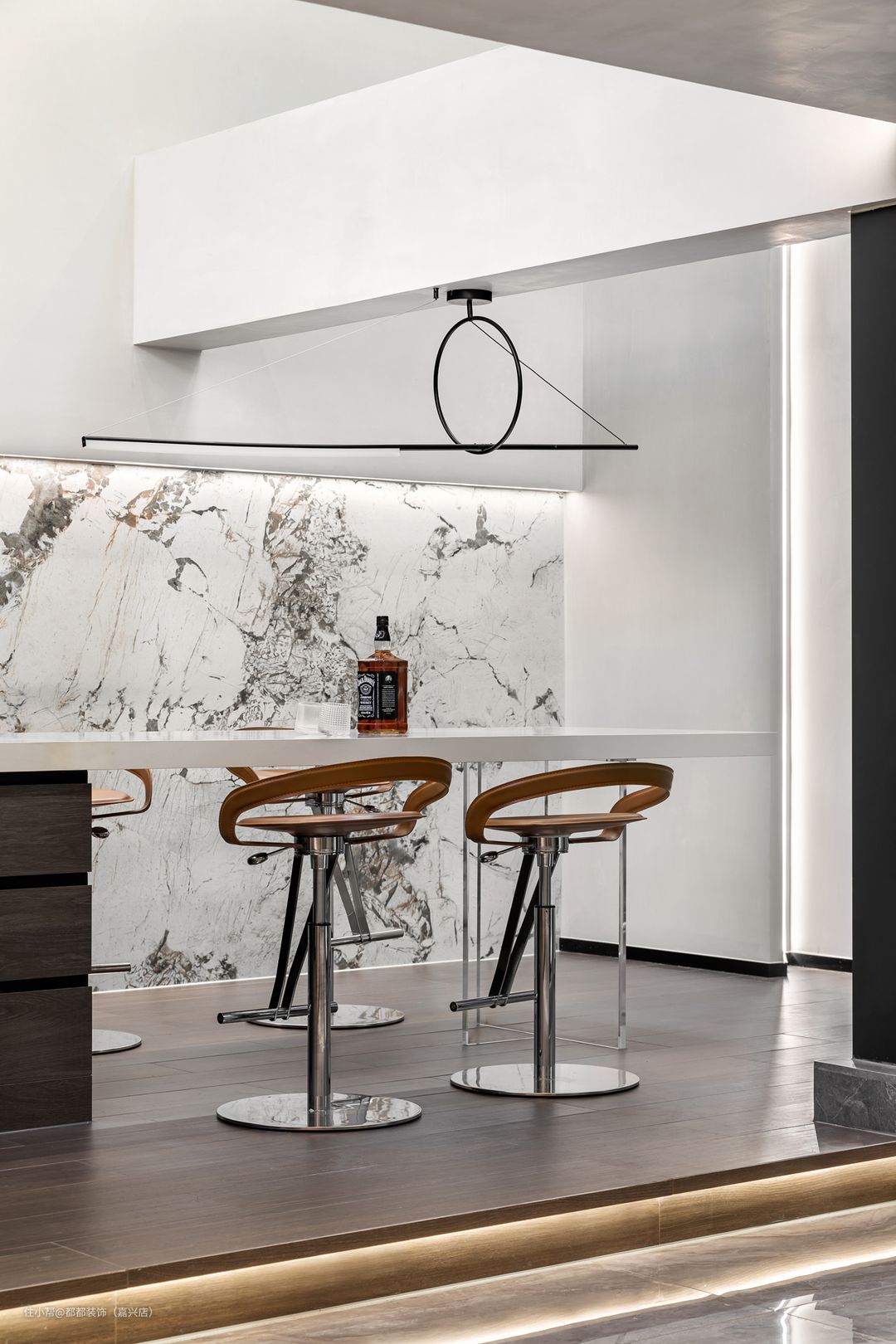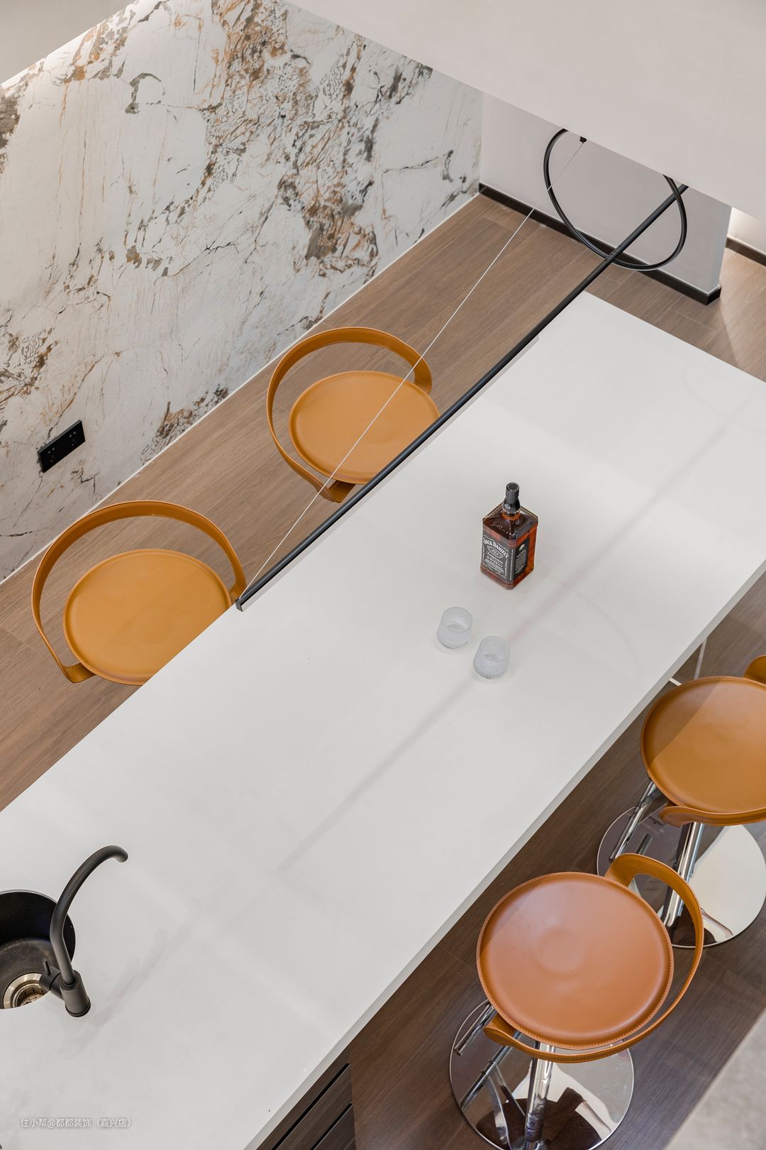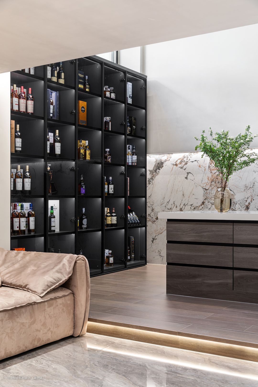 岛台以白色、棕色木纹覆盖,配以高脚橙色凳子,质感与色彩的碰撞,赋予空间时尚的气息,将大气简洁弥散其间,在此尽享舒适惬意的慢生活体验。黑色的酒柜通过灯光折射,如水如镜,轻盈澄净,梳理出优雅而精致的品酒氛围。