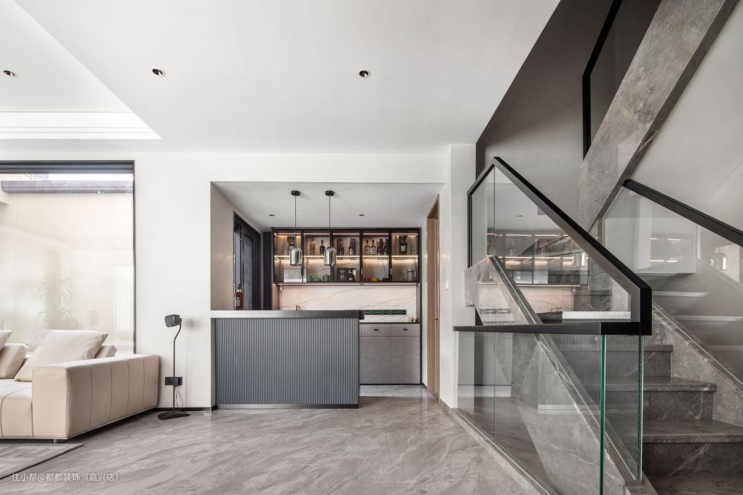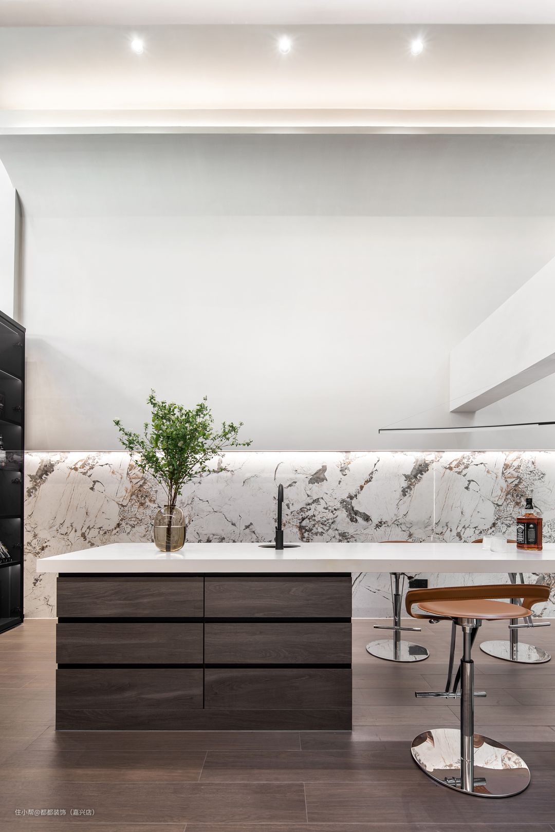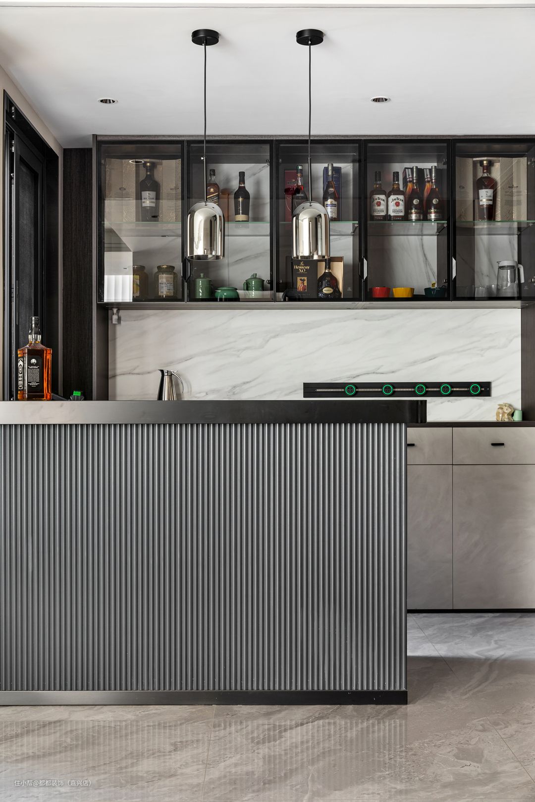 岛台以白色、棕色木纹覆盖,配以高脚橙色凳子,质感与色彩的碰撞,赋予空间时尚的气息,将大气简洁弥散其间,在此尽享舒适惬意的慢生活体验。黑色的酒柜通过灯光折射,如水如镜,轻盈澄净,梳理出优雅而精致的品酒氛围。