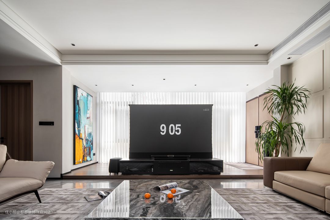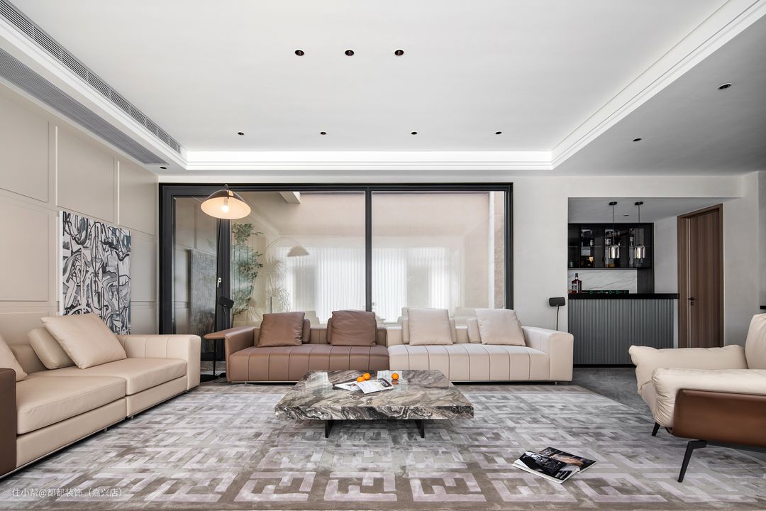 客厅中央的可升降电视机+收纳柜的组合,让智能科技与颜值并存,精彩的生活一键开启,隐藏在柜中的小影院,将生活的惬意感展现的淋漓尽致!在棕白调的空间,搭配上大理石纹理茶几,摆上同色系皮面沙发,布置上弧线钓鱼灯和抽象装饰画点缀,为理性空间注入一抹柔情,家的温馨感跃然眼前。柔和纱帘将引入室内的自然光线过滤的和煦温柔,渲染出轻松、自由、温暖的空间氛围,休闲时,播放舒缓的音乐,品上醇香的咖啡,惬意极了!