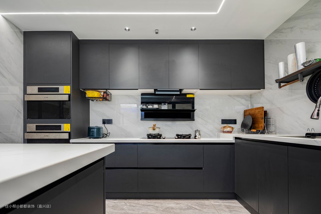 西厨空间以黑白的色调为渲染,干净简约的柜体立面,以体块与线条交叠出优雅的视觉张力,厨房整体呈U型设计,“洗——切——炒”分区,操作流线更流畅。