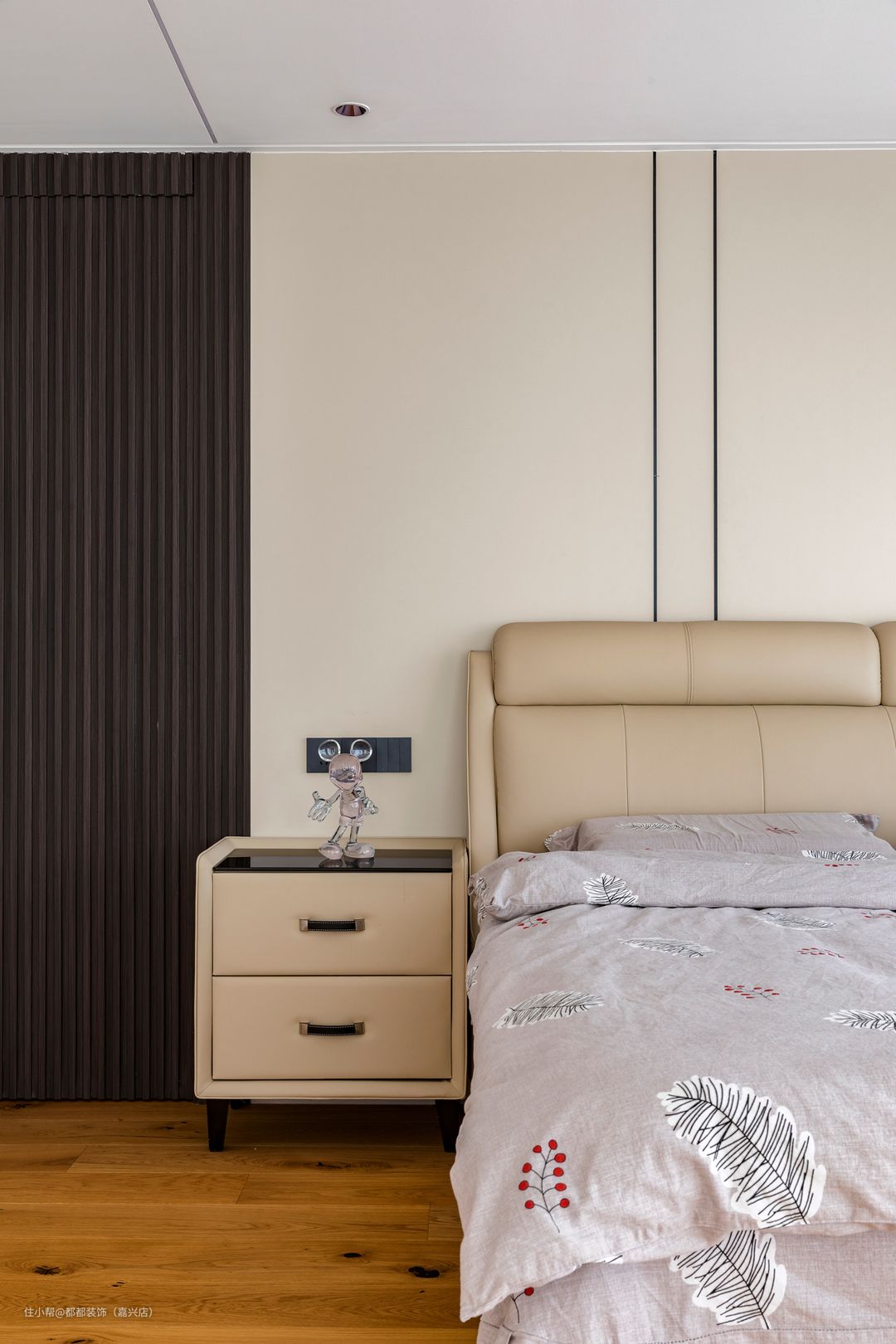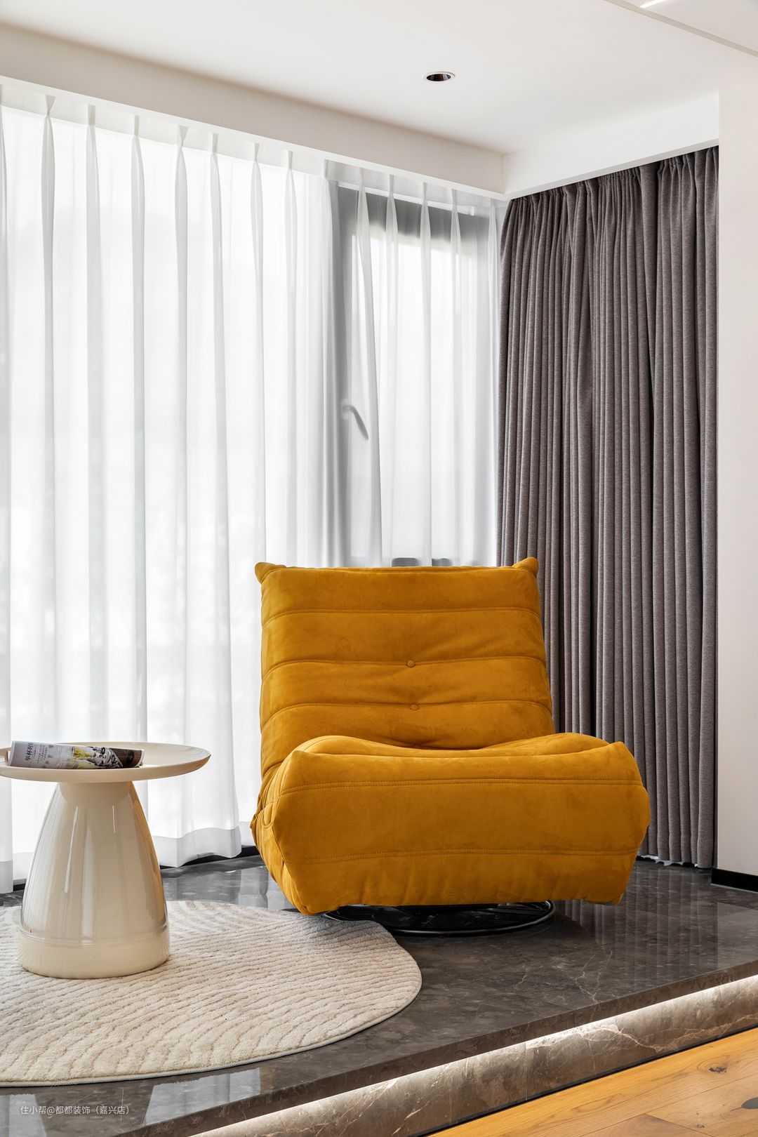 设计师特别定制集衣帽间、休闲区、化妆台于一体的主卧室,床头背景墙奶油色木饰面与深棕色木格栅形成冷暖碰撞,布置浅色系纯棉床品,优雅协调,姜黄色懒人沙发作为跳色,流畅的造型,时尚百搭。