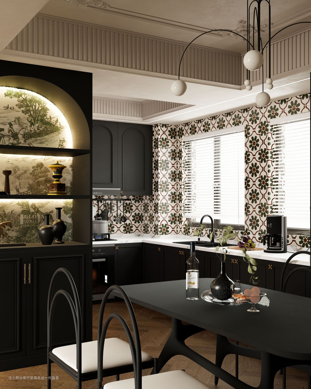 开放式处理,将餐厨空间利用最大化。精致角花加PU线条线条感满满,黑色餐桌椅、复古小花砖将空间复古氛围感拉满,弧型元素贯穿整个餐厨空间区域,营造温馨浪漫的氛围。餐边柜圆弧门楣搭配法式大板花砖灯带的加入,让整个家更显质感。