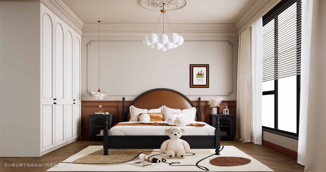 进入主卧空间,焦糖色涂料的背景映入眼帘,带点复古的味道,与床头软包呼应。同时这复古的味道,显得活力满满,整个空间不会显得过于单调。