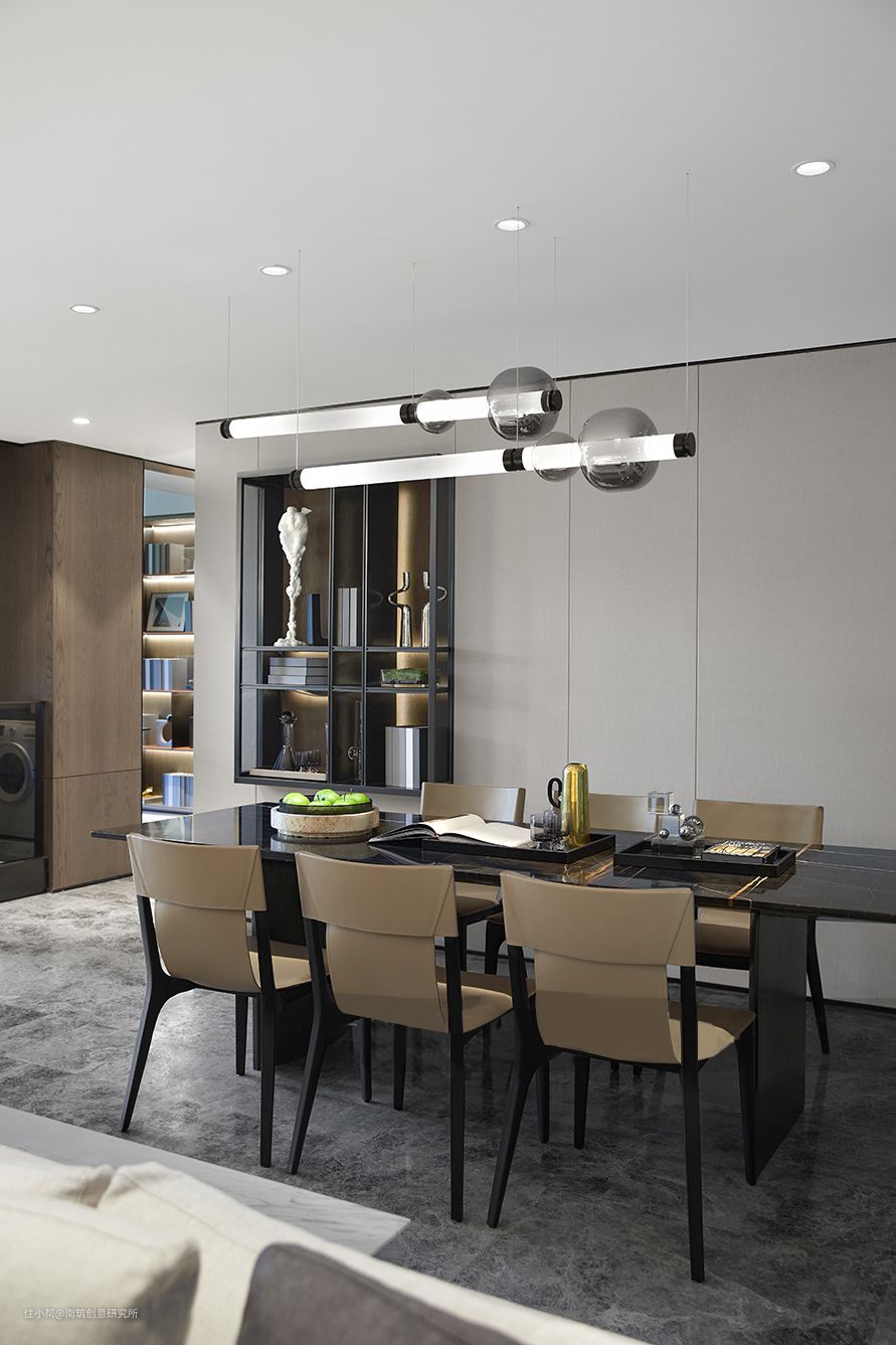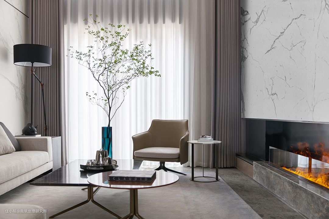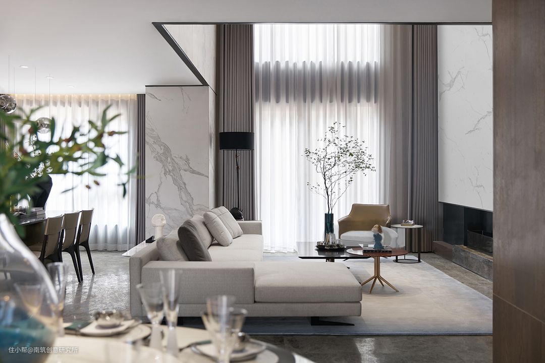 凭借建筑结构优势,打造开放、自由的空间格局,使得光线与风景都在室内有了落脚点,满足视觉要求的同时唤醒人与空间情绪感知的共鸣。整体在色调方面选取灰色系低饱和的色系配饰意在营造一种时尚经典,神秘、稳重而又不失大气格调的韵味追求,通顶式的置物架简洁实用,足以满足户主摆放自己的艺术收藏或是书籍的需求。客厅巨大的落地窗与外面的花园景观相连接,使户主能够最大程度的将室外美景收入眼中。无主灯的设计也促使整个空间更加简洁明快。