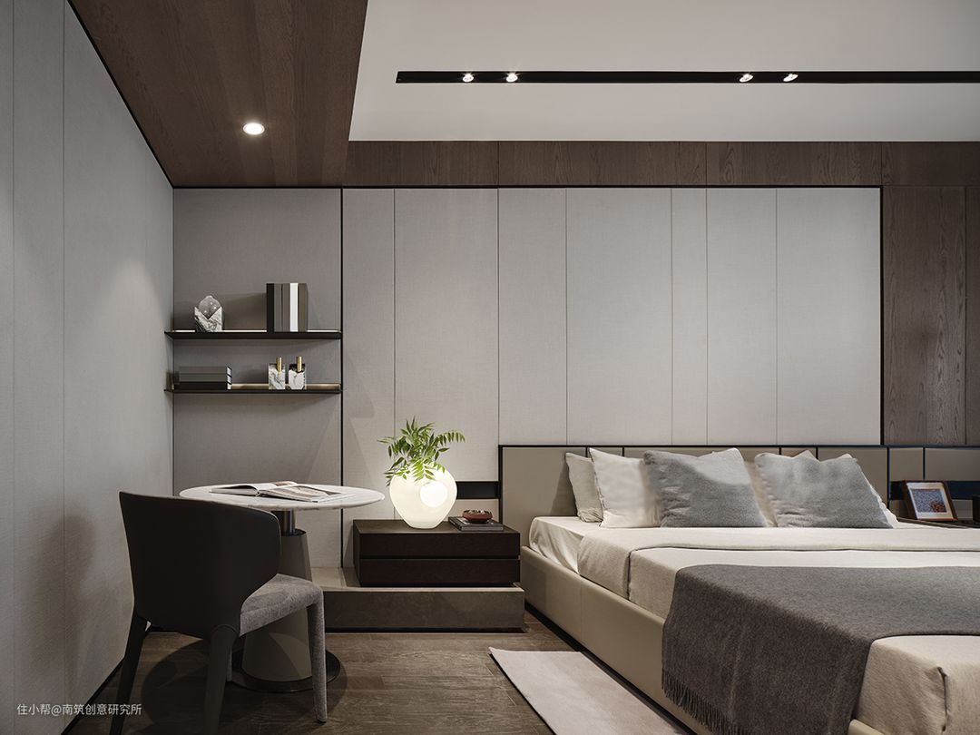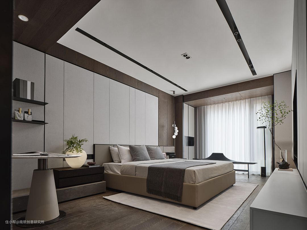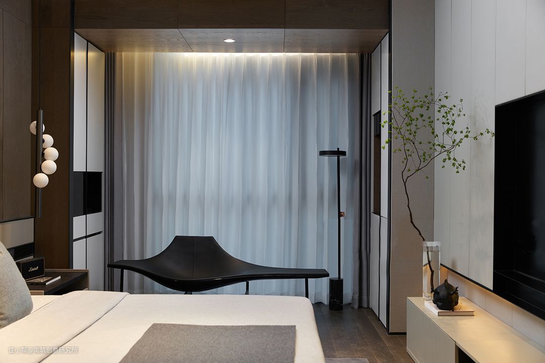 主卧采用相对成熟典雅的色调风格,无主灯的设计让居室更显大气空旷。落地窗的设计保证了整个室内空间照明的明亮通透。业主有睡前阅读的习惯,搭配在窗边的黑色艺术座椅也能为室内增添一分设计感。在闲暇的午后泡杯茶,坐在这里既能欣赏美景又能安心阅读。电视采取内嵌的方式既节省空间又美观。