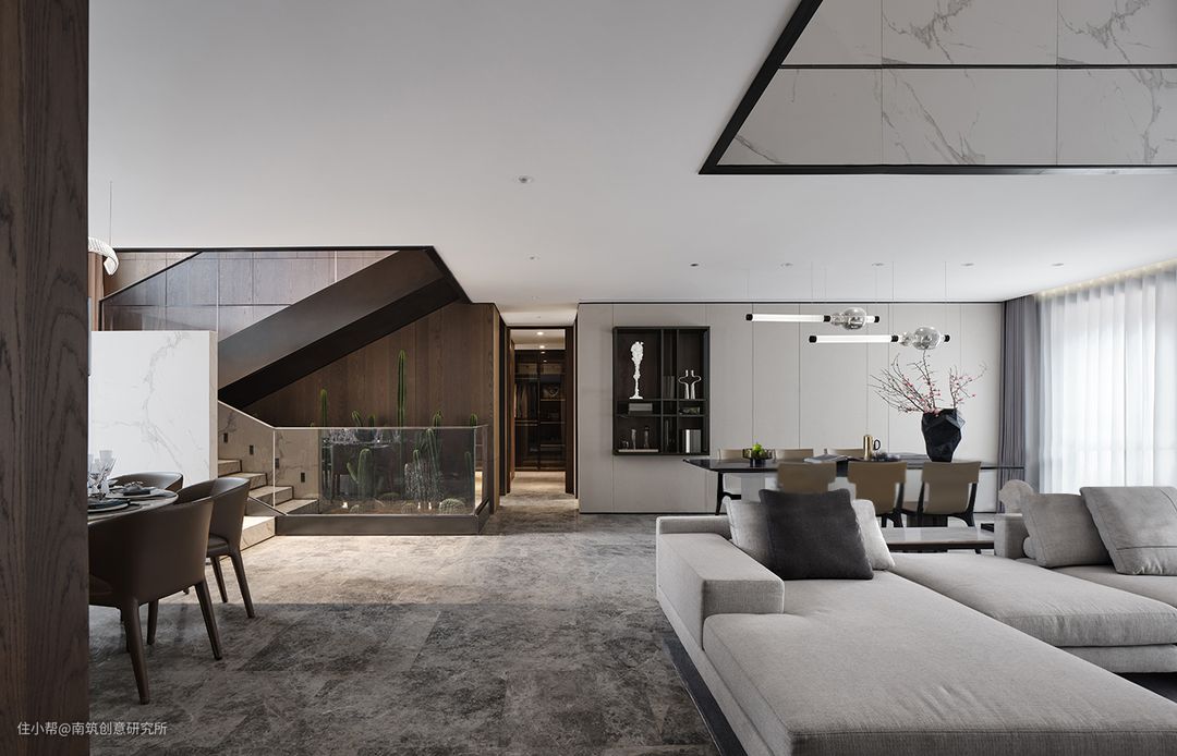 考虑到整体空间的美观以及后期打理方面可能会产生的各种问题,选用大理石质地的材料作为踏板,采用玻璃围栏作为扶手也可以拉大视觉上的空间感。在楼梯底部的镂空部位设立了一处用来摆放绿植景观的区域,以满足户主的具体需求同时又不失雅致美观。