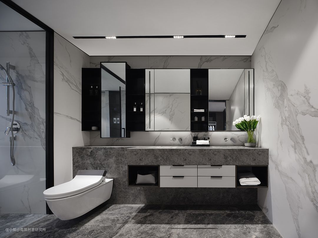 针对业主的具体诉求和需要,卫生间决定采取干湿分离的的布局,更便于业主进行打扫清洁保证卫生间的相对干净。悬挂式的洗手台和马桶也有一定增大空间的视觉效果。黑白灰的经典搭配以及大理石质感的搭配应用更彰显大气成熟的氛围。洗手台的墙面上选用多功能收纳柜与镜子的组合,在满足了日常收纳的同时,又能满足平时梳洗的需要,可谓是一举两得。
