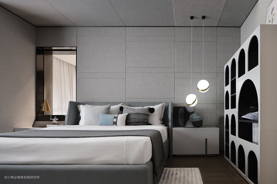 空间主体选取饱和度较低的灰色调,悬挂下来的球形小吊灯小巧可爱也给整个空间注入了一丝活力,不会过于沉闷严肃。门洞式的衣柜,既能贴合户主对于衣物收纳的实际需求,又不会显得过于死板反而多了一丝活泼特别的韵味。