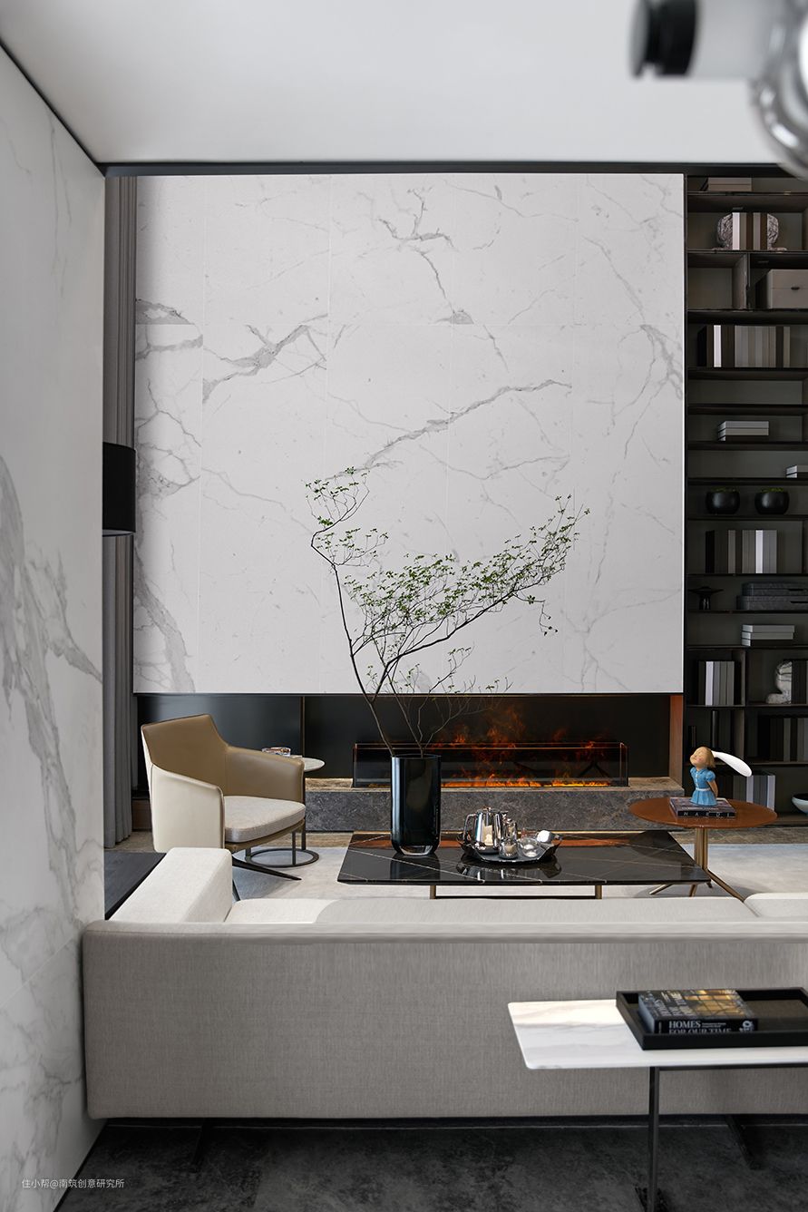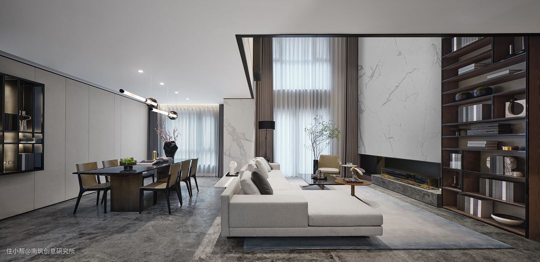 凭借建筑结构优势,打造开放、自由的空间格局,使得光线与风景都在室内有了落脚点,满足视觉要求的同时唤醒人与空间情绪感知的共鸣。整体在色调方面选取灰色系低饱和的色系配饰意在营造一种时尚经典,神秘、稳重而又不失大气格调的韵味追求,通顶式的置物架简洁实用,足以满足户主摆放自己的艺术收藏或是书籍的需求。客厅巨大的落地窗与外面的花园景观相连接,使户主能够最大程度的将室外美景收入眼中。无主灯的设计也促使整个空间更加简洁明快。