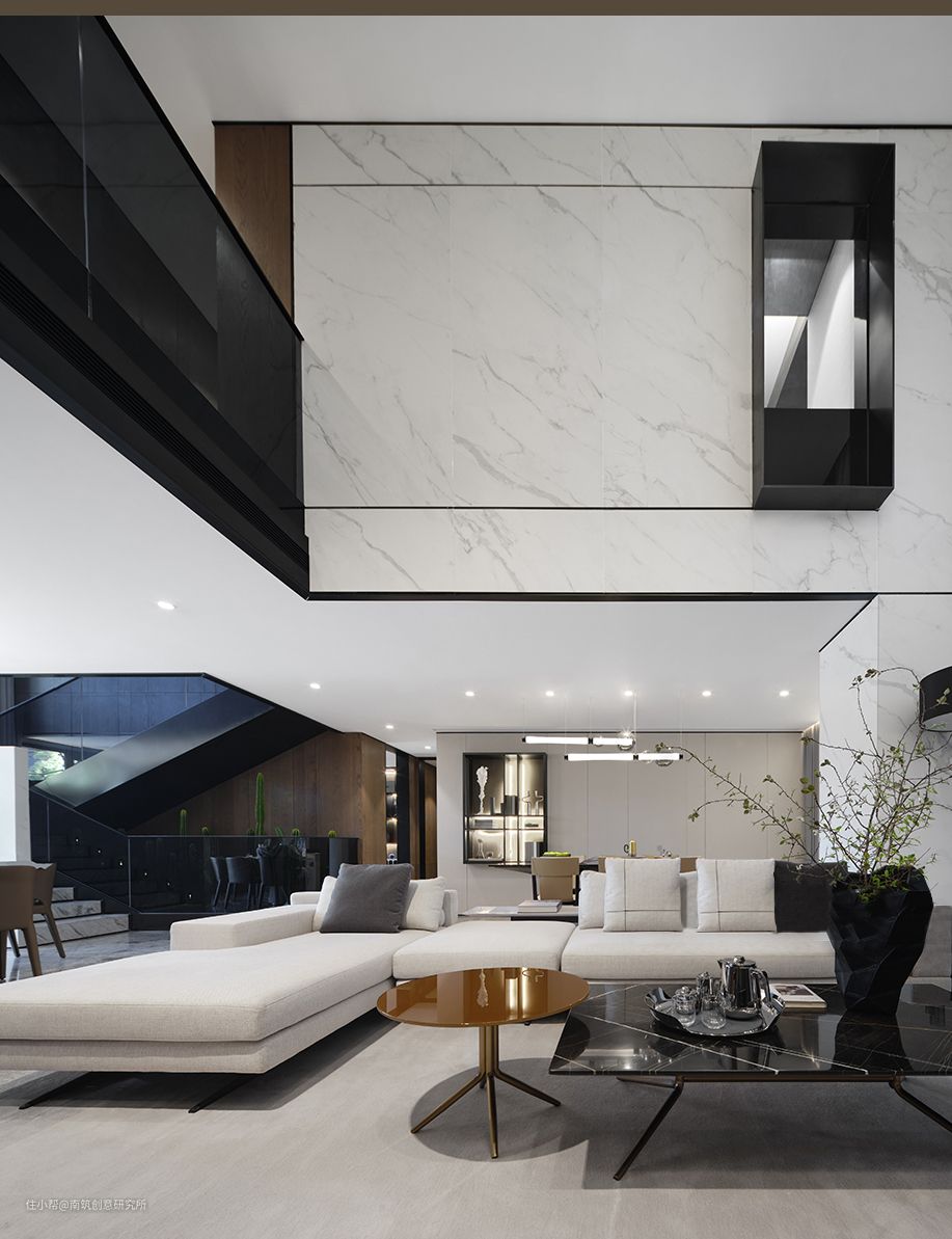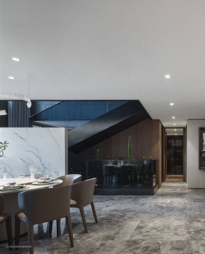 考虑到整体空间的美观以及后期打理方面可能会产生的各种问题,选用大理石质地的材料作为踏板,采用玻璃围栏作为扶手也可以拉大视觉上的空间感。在楼梯底部的镂空部位设立了一处用来摆放绿植景观的区域,以满足户主的具体需求同时又不失雅致美观。
