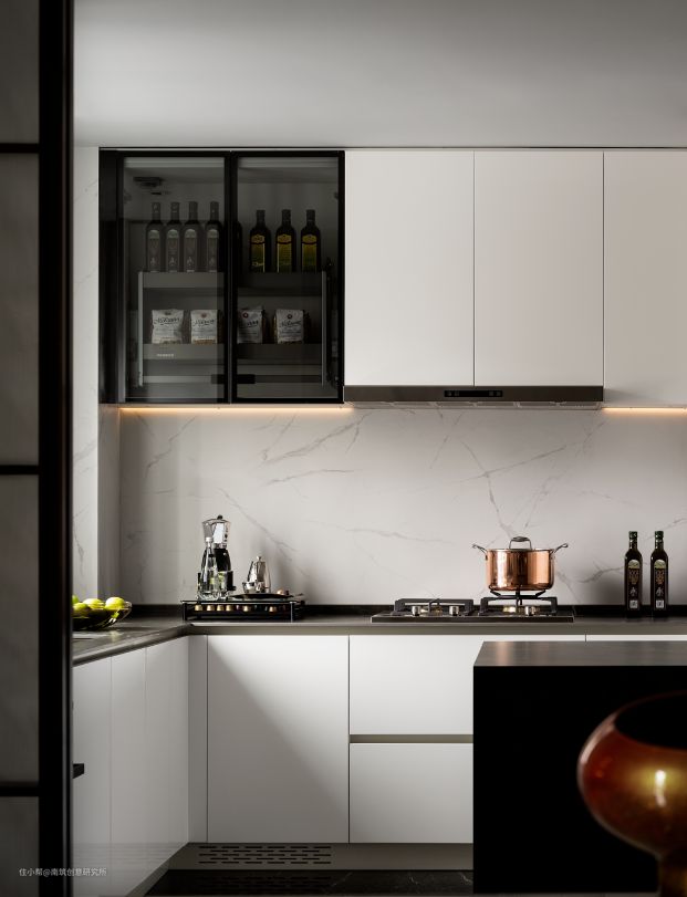 女主人喜爱美食经常自己下厨做菜,考虑到油烟的扩散以及后续在卫生清洁方面可能会产生的各种问题,经过讨论决定在原本的厨房中间用玻璃隔出干、湿两区。墙面增设置物收纳柜,以便满足户主日常的储物需要。