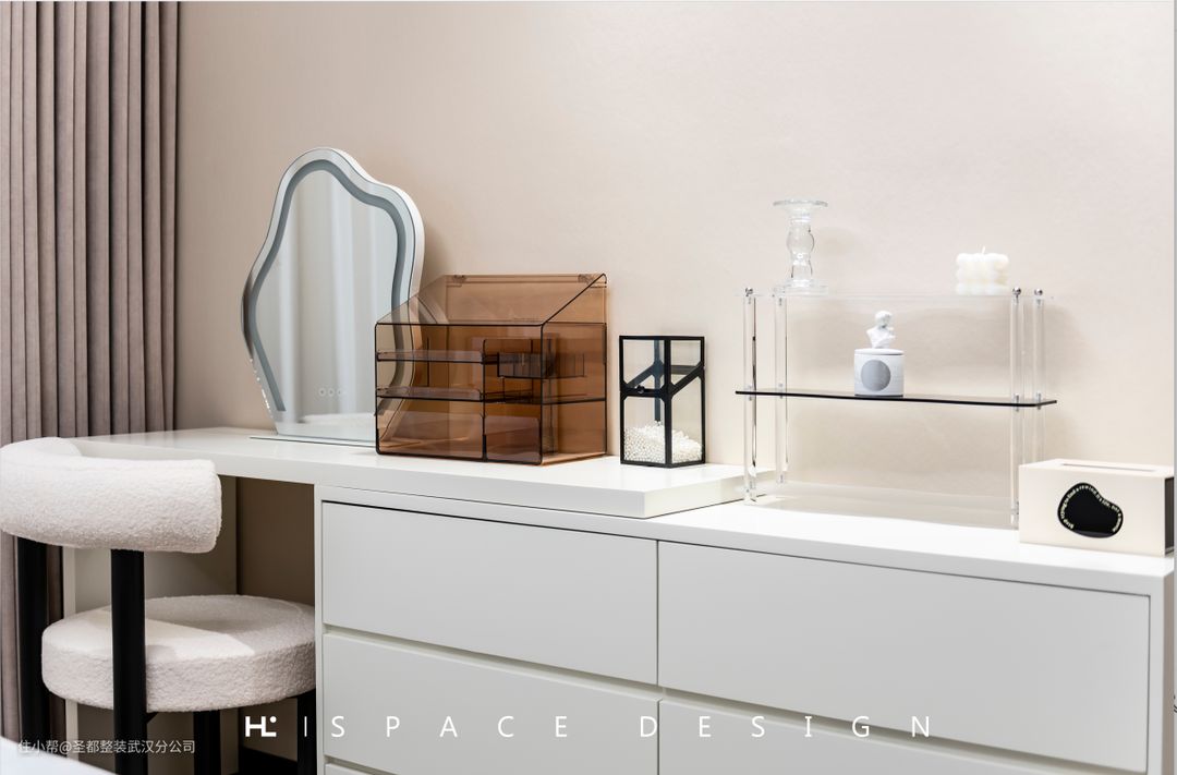 床尾处规划出一片创意感十足的梳妆镜,连同白色的收纳柜,让女主人从晨起就能享受“当窗理云鬓”的快乐。