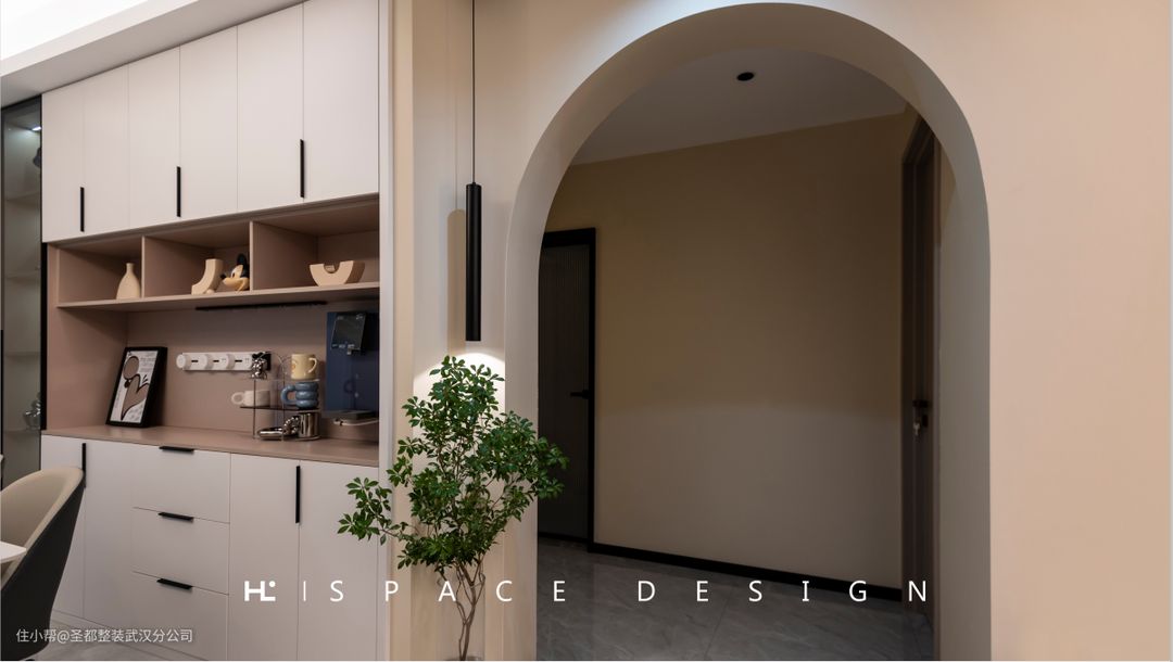 餐厅与客厅同处一室,显得舒阔而通透;以弧形拱门为区分,隔而不断,又保持了空间的相对独立。 温润的木质肌理清晰可见,大理石自带轻奢气息,两者经过加工后变身为华丽餐桌,彰显出主人的非凡品位与雍容气度。