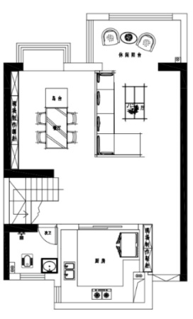 一楼平面布局图:建筑面积158㎡的复式,一楼主要作为活动区。南进门入户,直见客厅区,玄关与厨房毗邻而设。大横厅的户型,开阔明朗,客厅纳入休闲阳台,优化室内采光。
