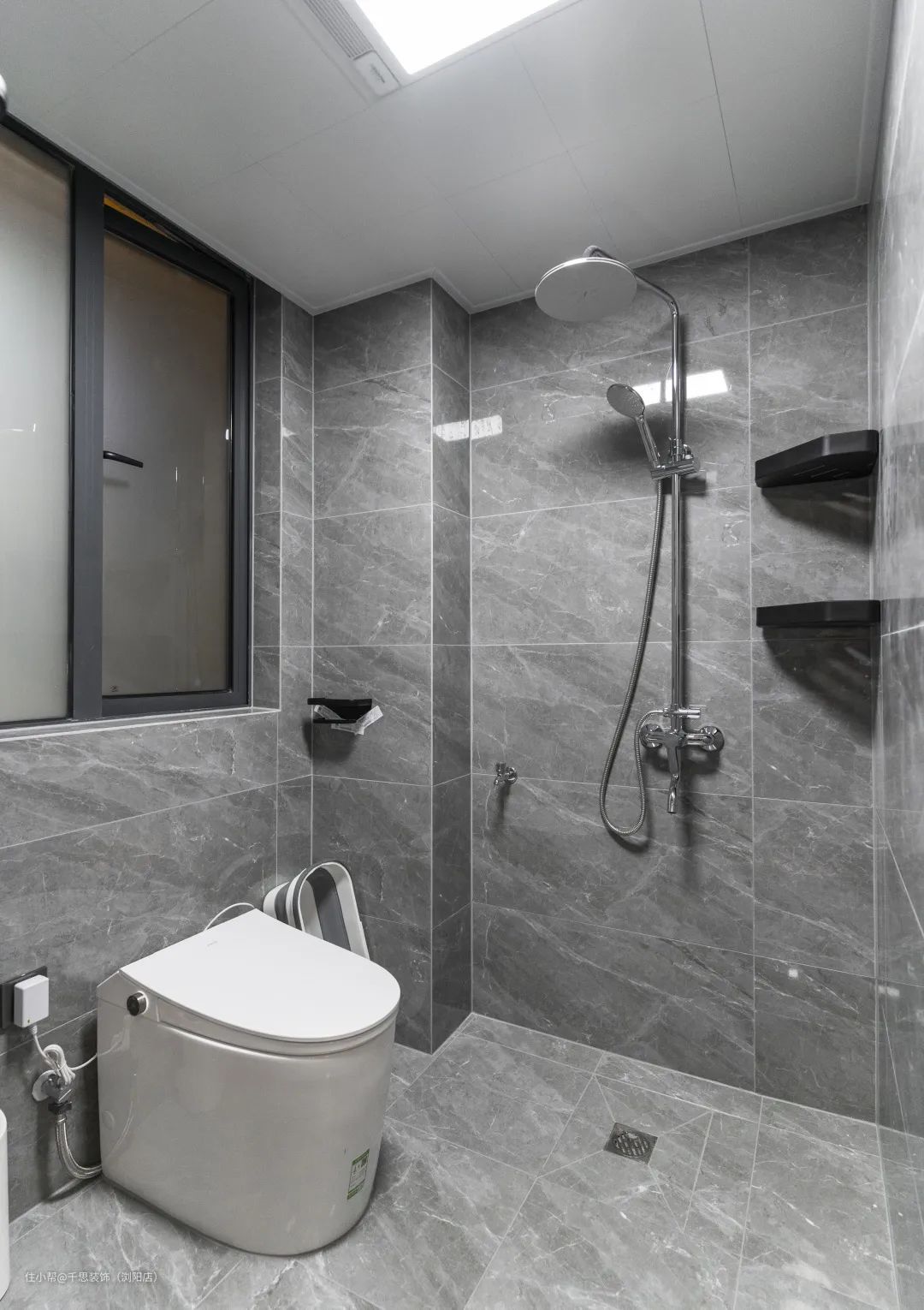 卫生间的设计简而不凡,墙地砖一体布局,增强空间的整体性。仍以灰色为主色调展开,黑白的加入,营造清爽简洁的卫浴环境。