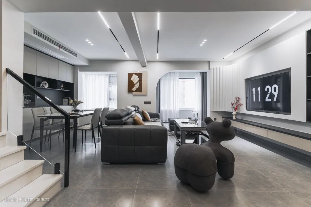 楼梯,位于厨房与客餐厅交接处。开放式客餐厅布局,让空间归整,使得整体开放、流通。顶面无主灯布局,增加视觉层次与氛围感。